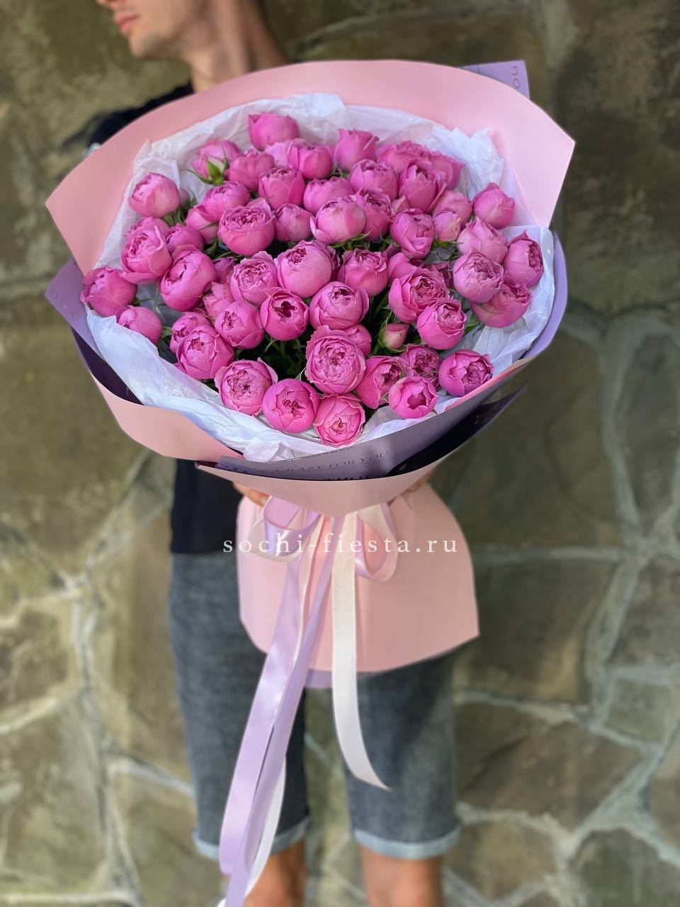 101 кустовая пионовидная роза, лента, дизайнерская упаковка.