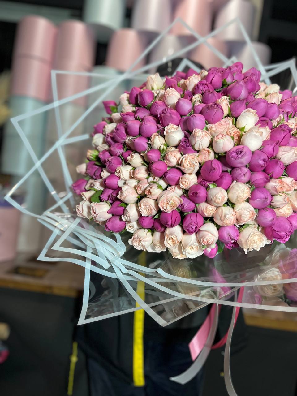 Масштабная композиция из ста одной кустовой пионовидной розы занимает всё внимание. Множество бутонов с волнистыми лепестками создают живую фактуру и впечатляющее присутствие в любом пространстве.