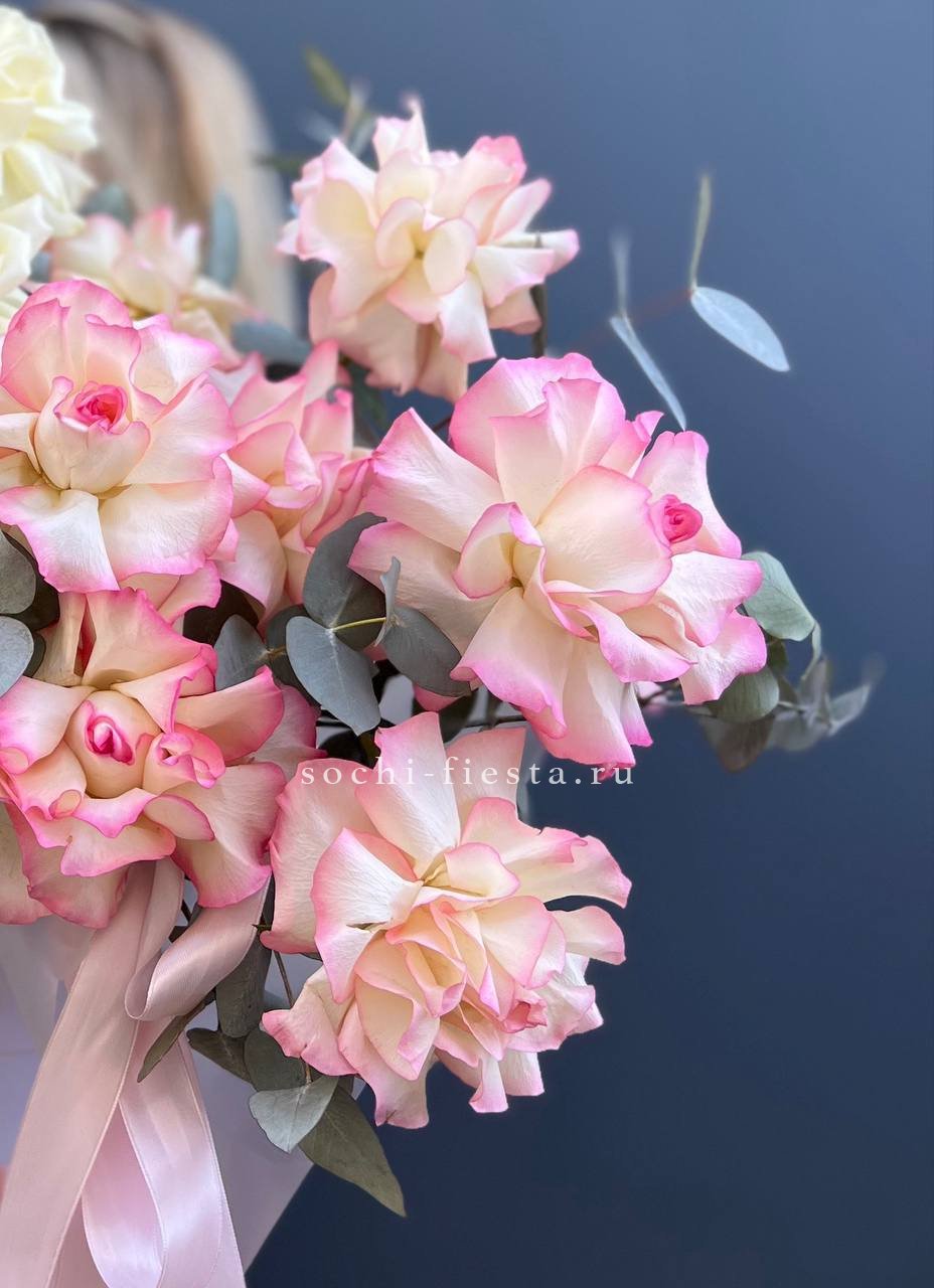 вывернутые белые розы и джумилия, цилиндр D16, эвкалипт, лента, упаковка.