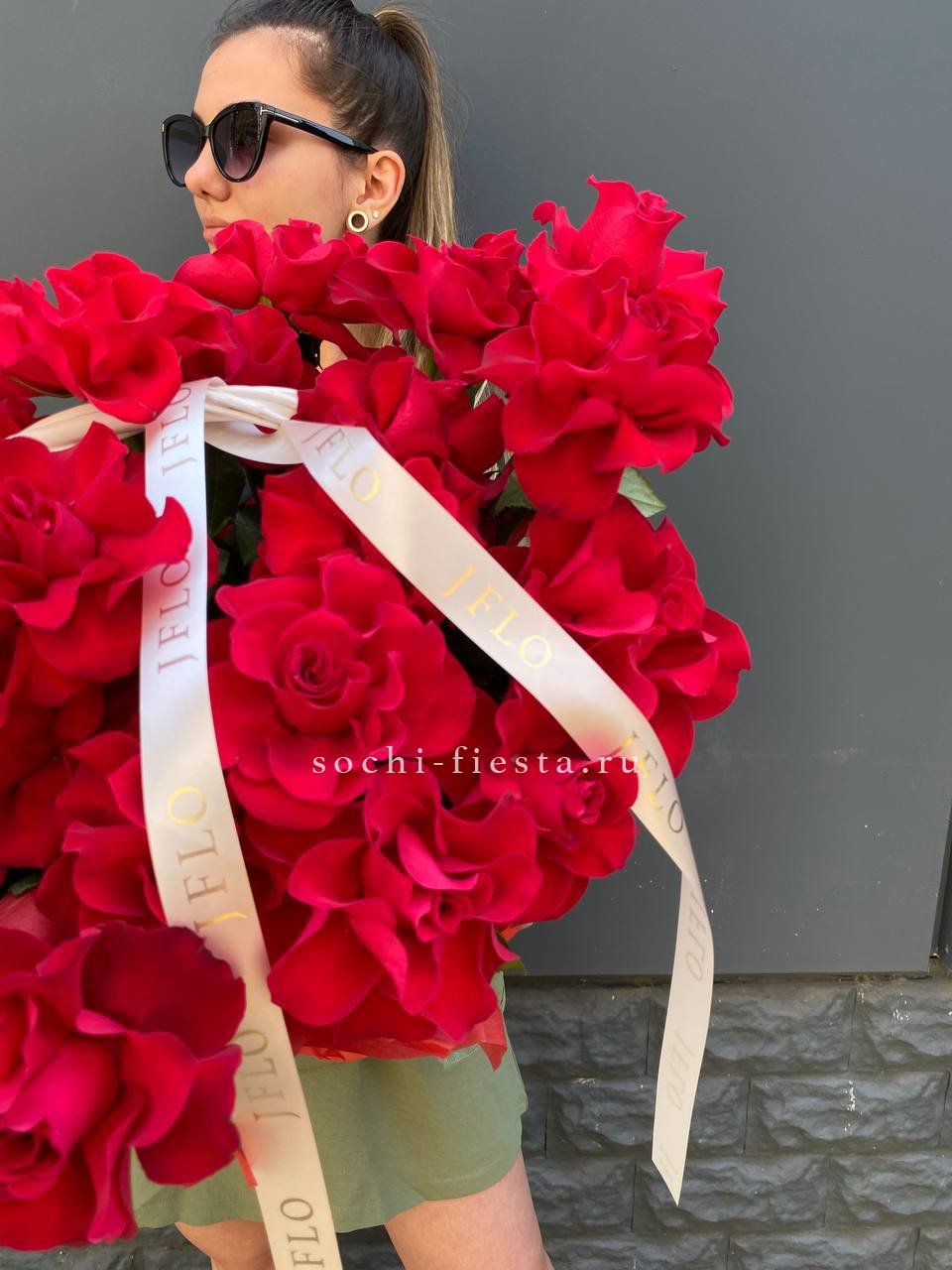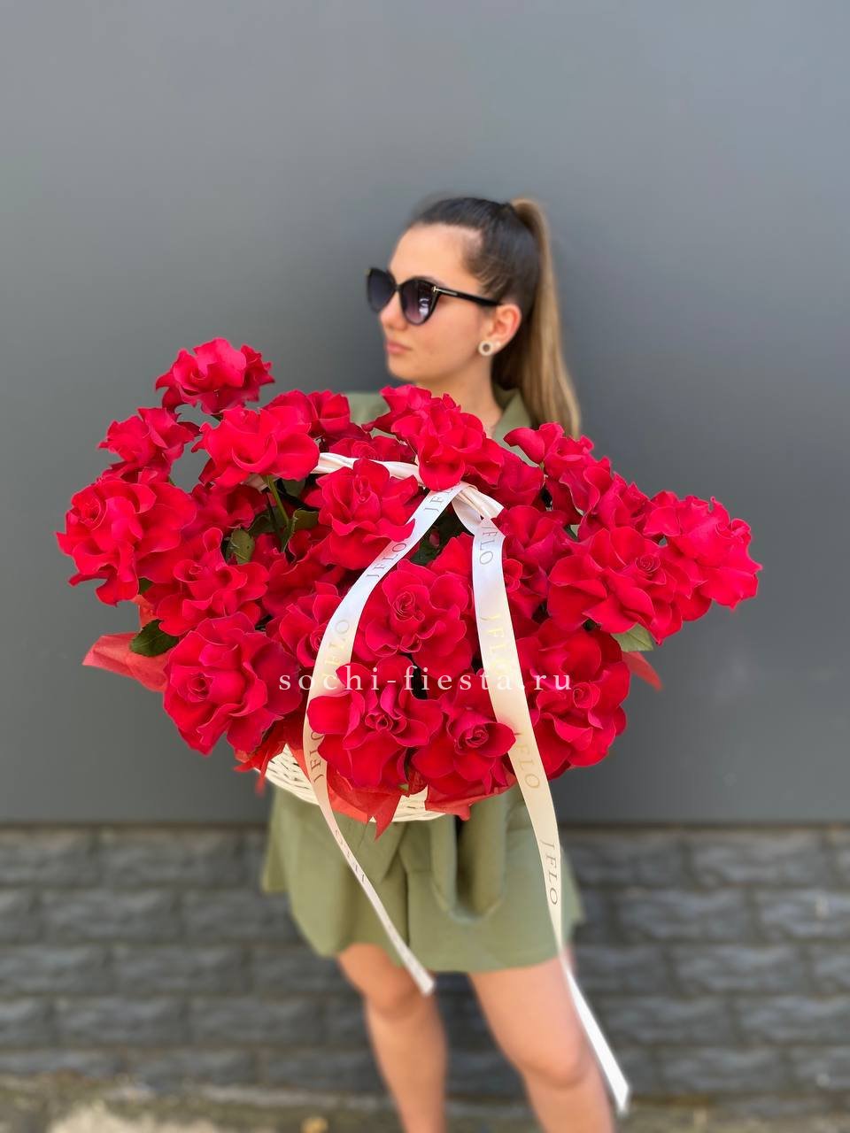Двадцать пять вывернутых французских роз образуют плотную полусферу насыщенного оттенка. Натуральное джутовое кашпо добавляет композиции природной простоты и завершённости.