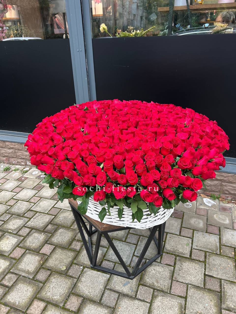 Французские розы глубокого красного оттенка образуют плотное цветочное полотно в корзине. Пятьсот один бутон создает монументальную композицию, где каждый цветок усиливает общее впечатление.