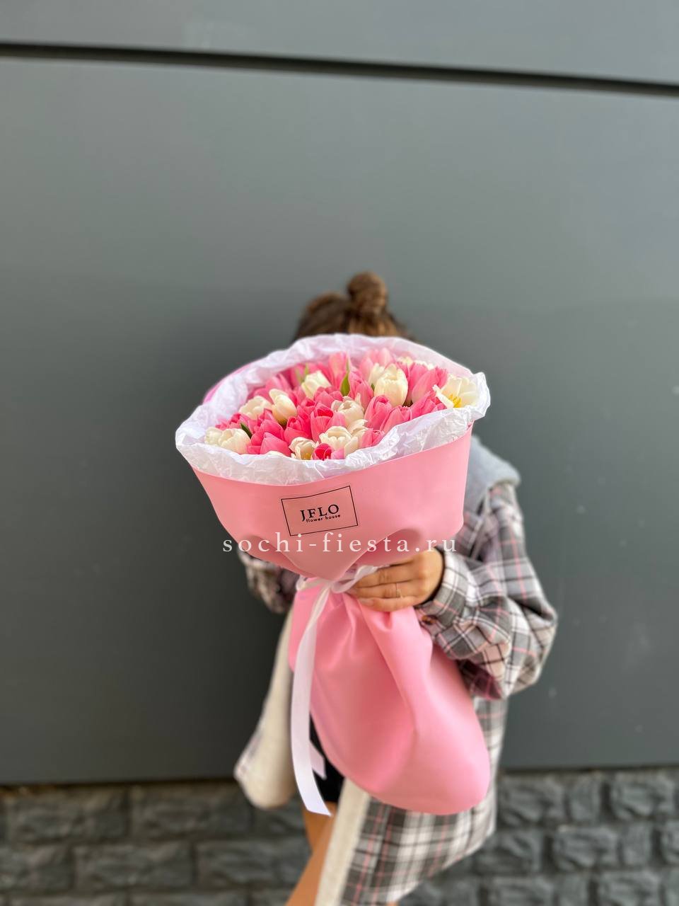 Пятьдесят один бутон в мягкой бело-розовой гамме создает объемную форму с живым ритмом. Микс оттенков добавляет воздушности и естественной динамики композиции.