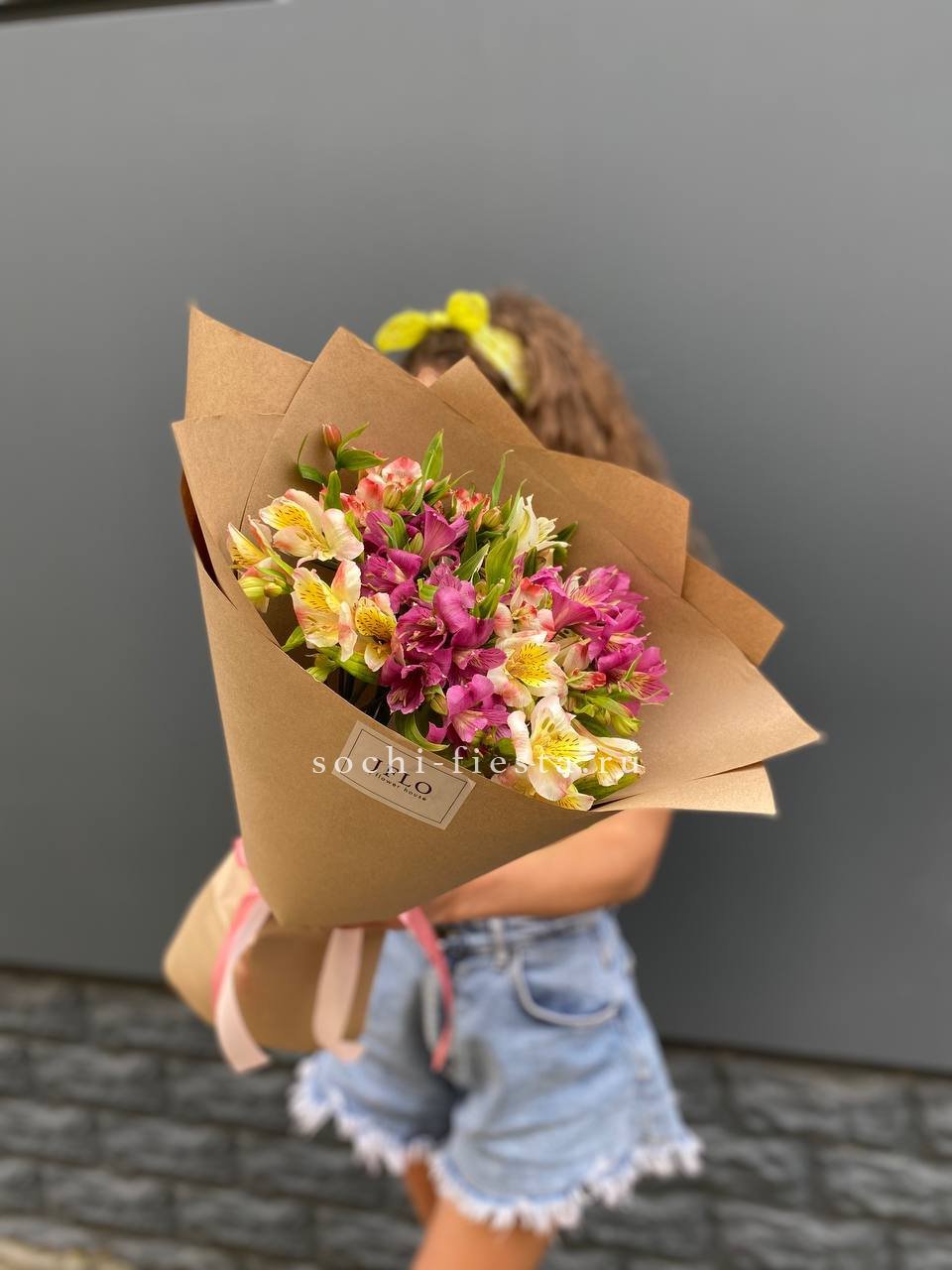 Девять веток альстромерий собраны в свободную композицию и обернуты натуральным крафтом. Естественная форма с лёгким наклоном линий создаёт живое и непринуждённое впечатление.