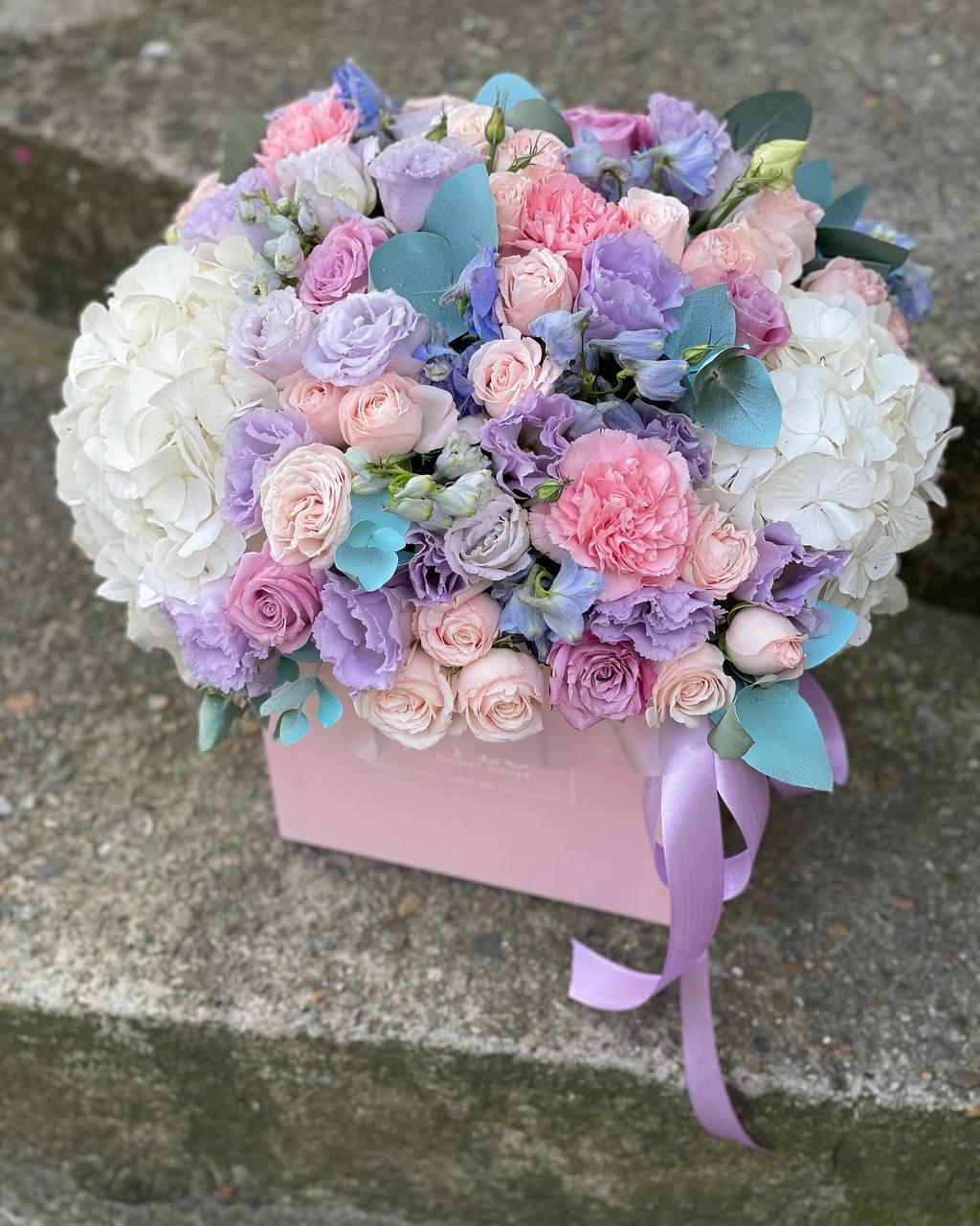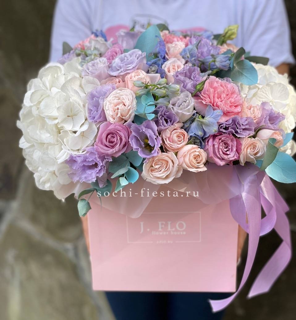 гортензия, вывернутые розы, лимониум(или аналог в несезон), лента, авторская упаковка.