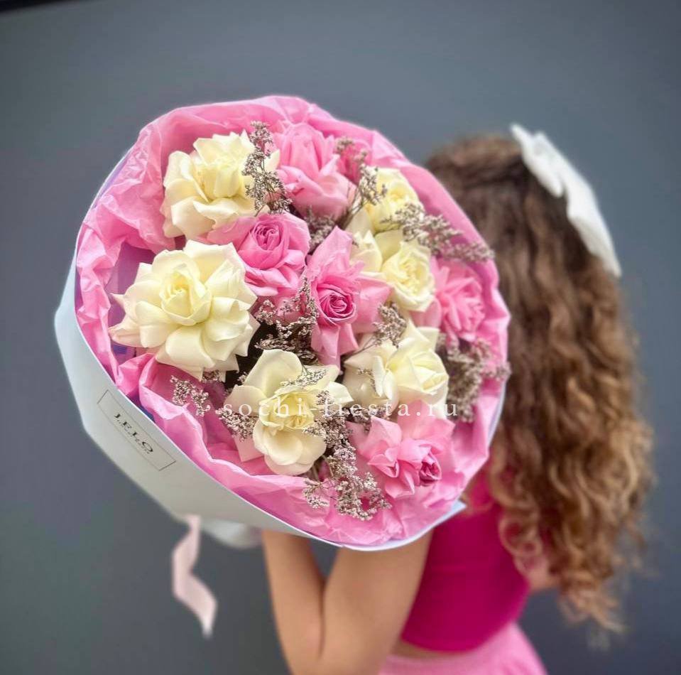 Букет с вывернутыми розами и пушистыми шапками гортензии создает легкое французское настроение. Лимониум вплетается тонкими ветвями, добавляя воздуха между бутонами.