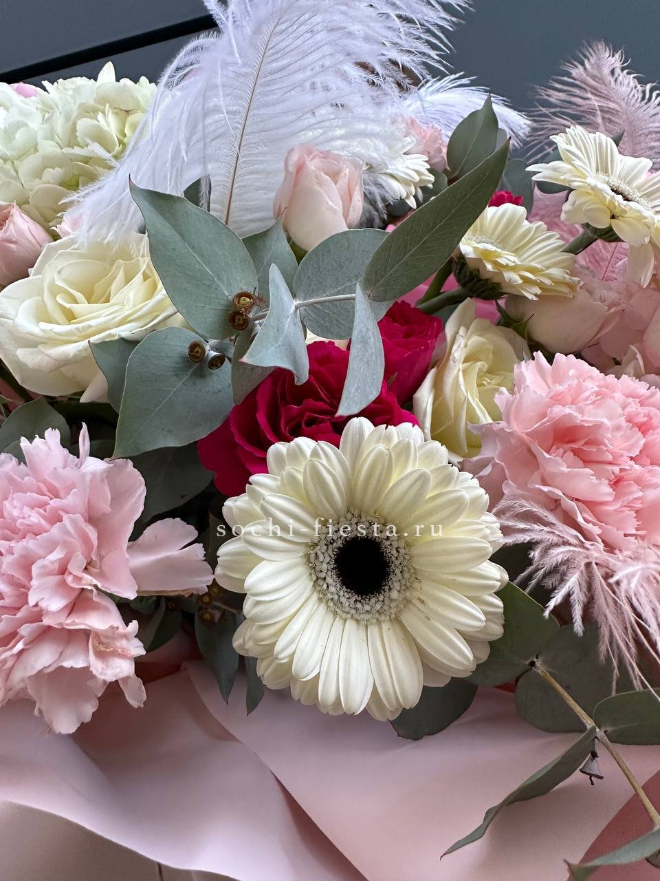 эустома, розы, пионовидные розы, озотамнус или аналог, диантусы, макаронс, декоративная зелень, коробка-сердце.