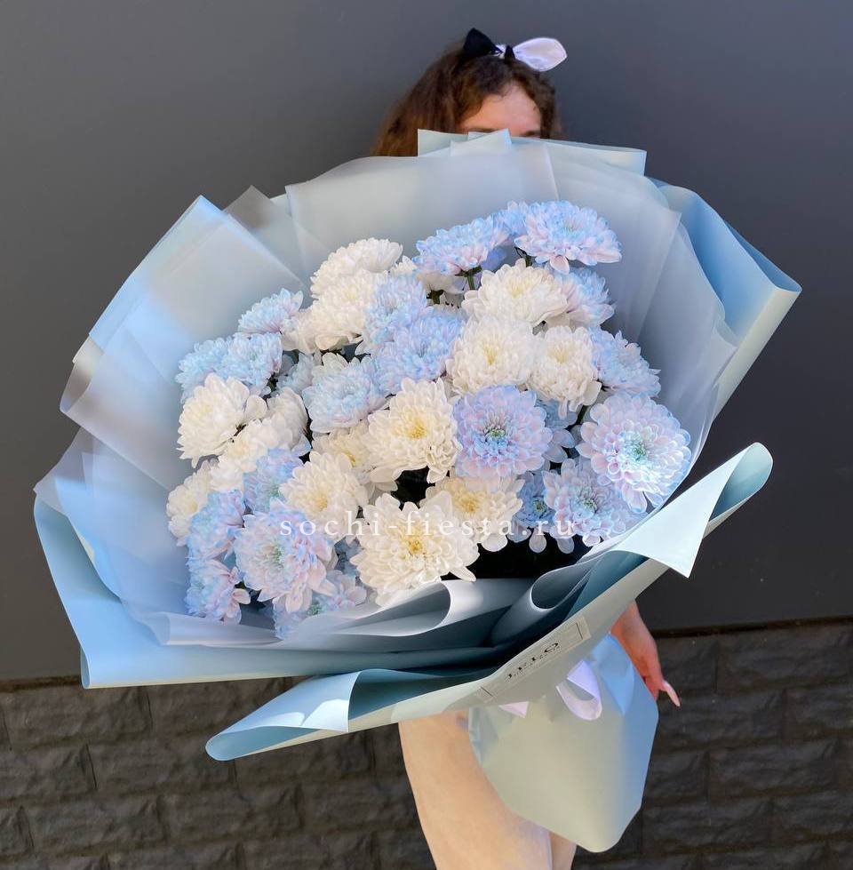 Девять кустов хризантемы в синих тонах собраны в плотную шапку. Каждый стебель несёт множество мелких соцветий, которые раскрываются постепенно. Такой букет сохраняет свежесть долго и радует насыщенным цветом.