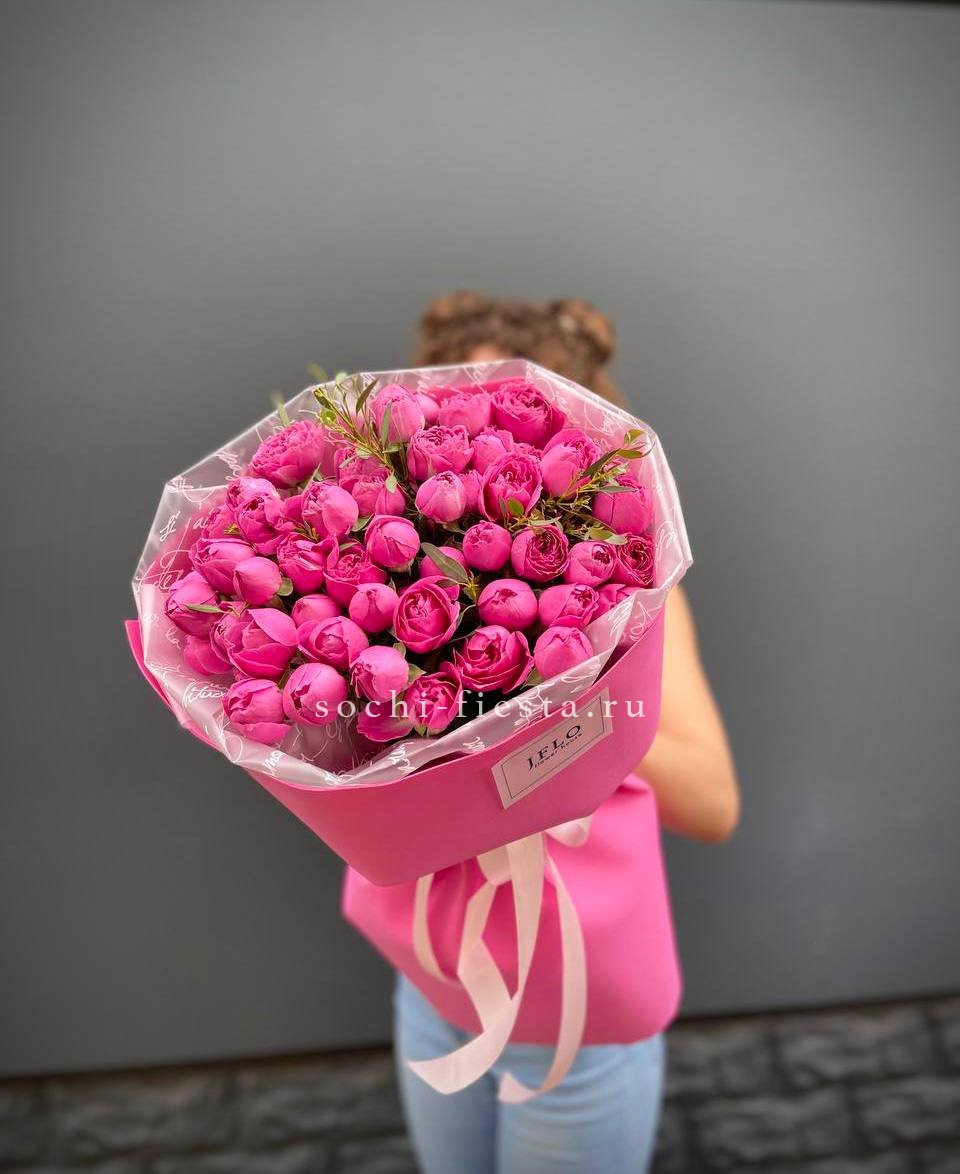 эустома, розовые пионы Сара Бернар, пионовидные розы, дельфиниум (замена вне сезона), тюльпан (замена вне сезона), лента, дизайнерская упаковка.