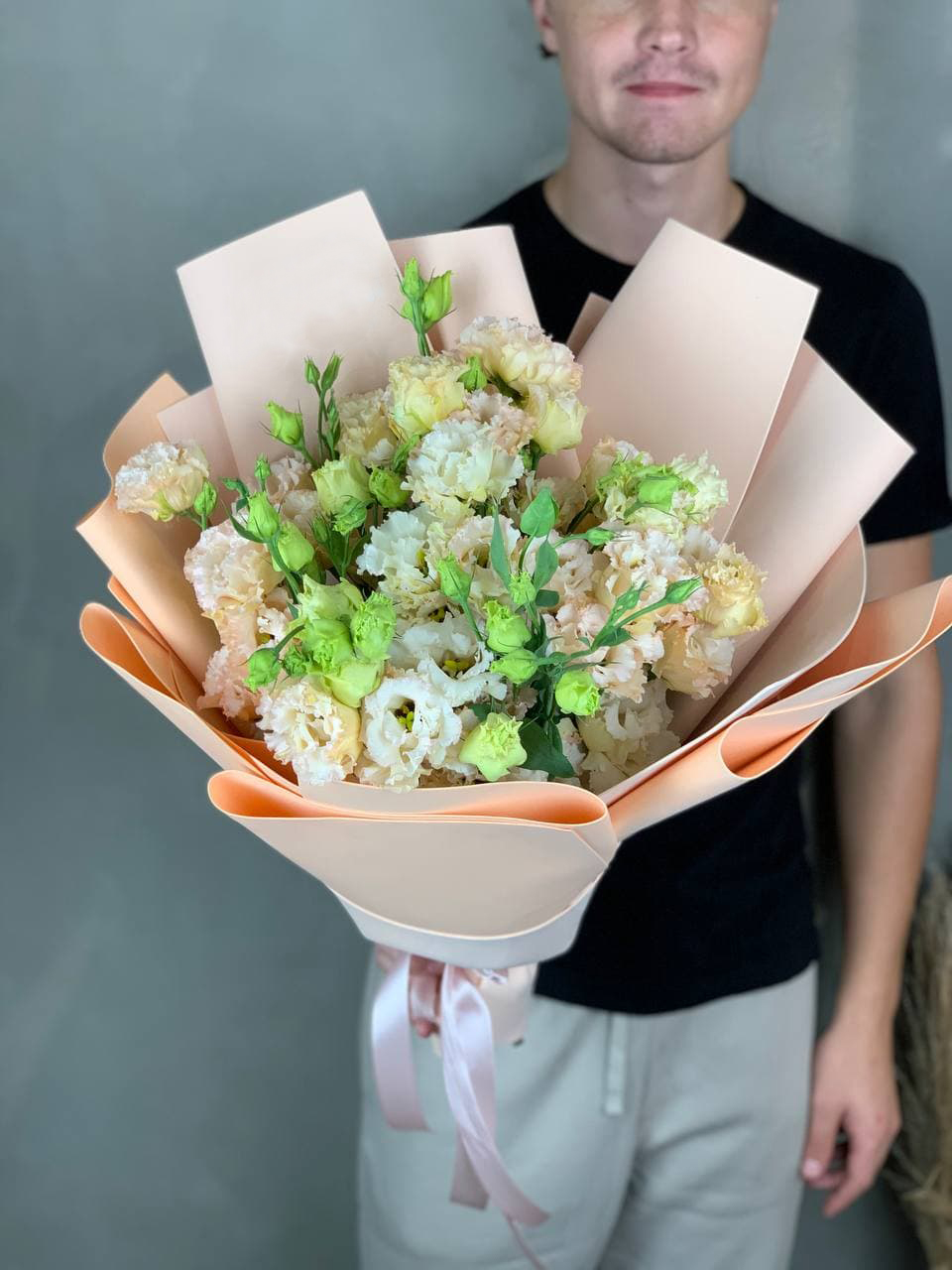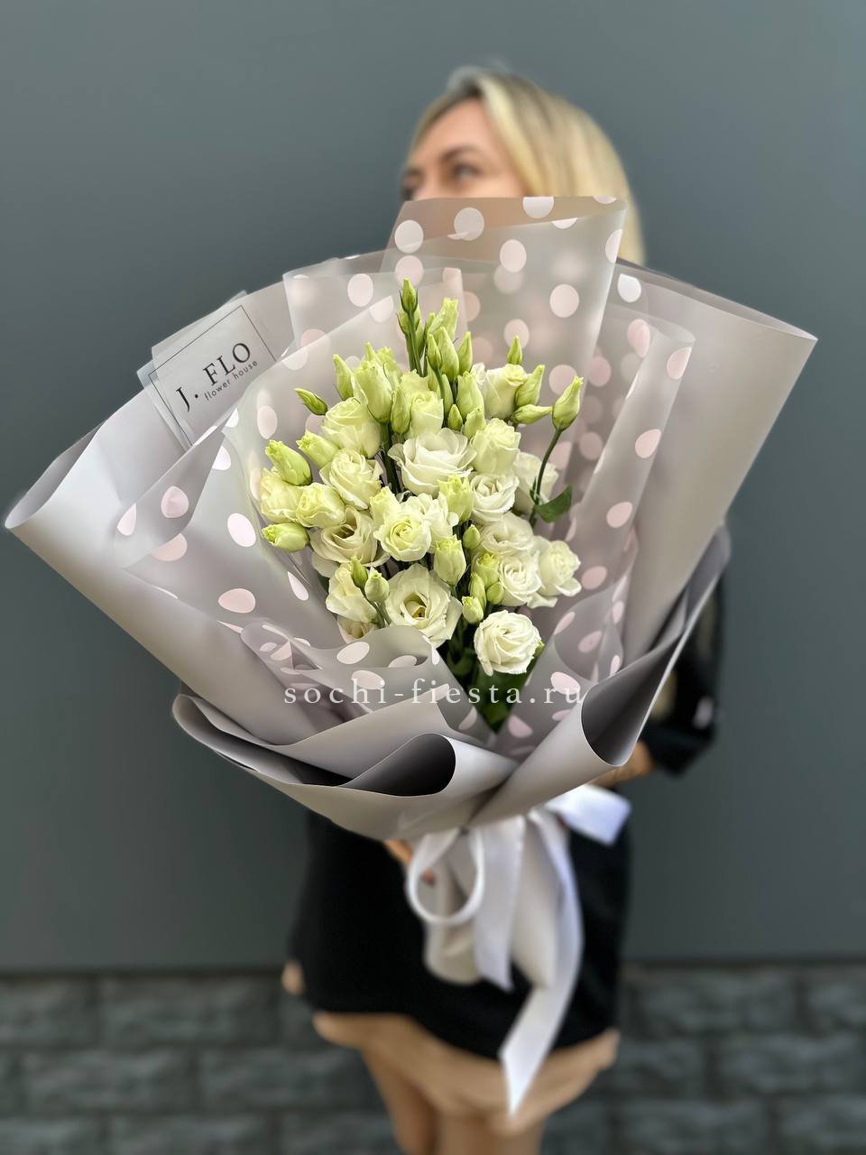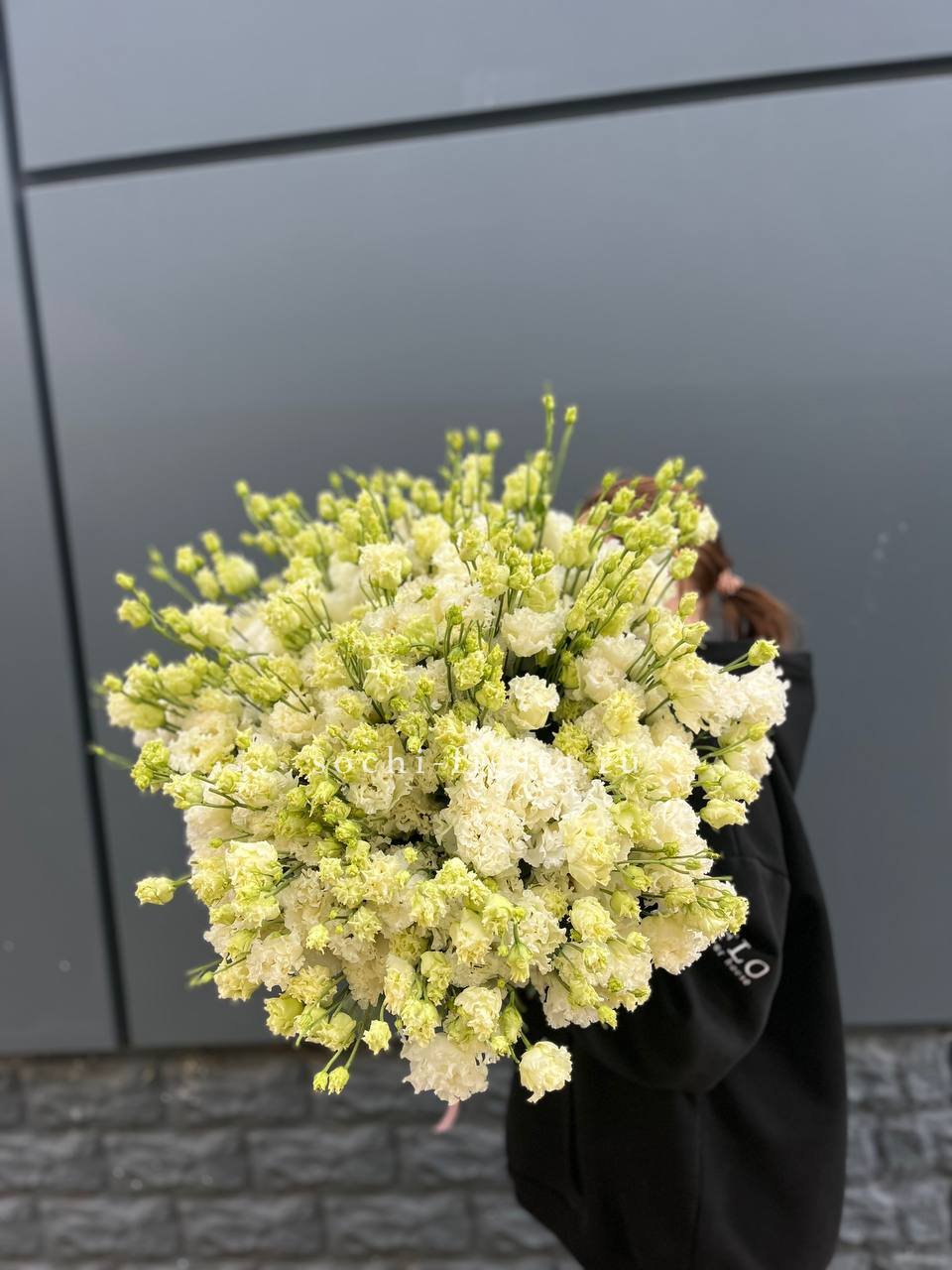 Сто один стебель белоснежной эустомы с многоярусными бутонами собраны в воздушный букет. Каждый цветок напоминает миниатюрную розу и вместе они образуют лёгкую скульптурную форму.