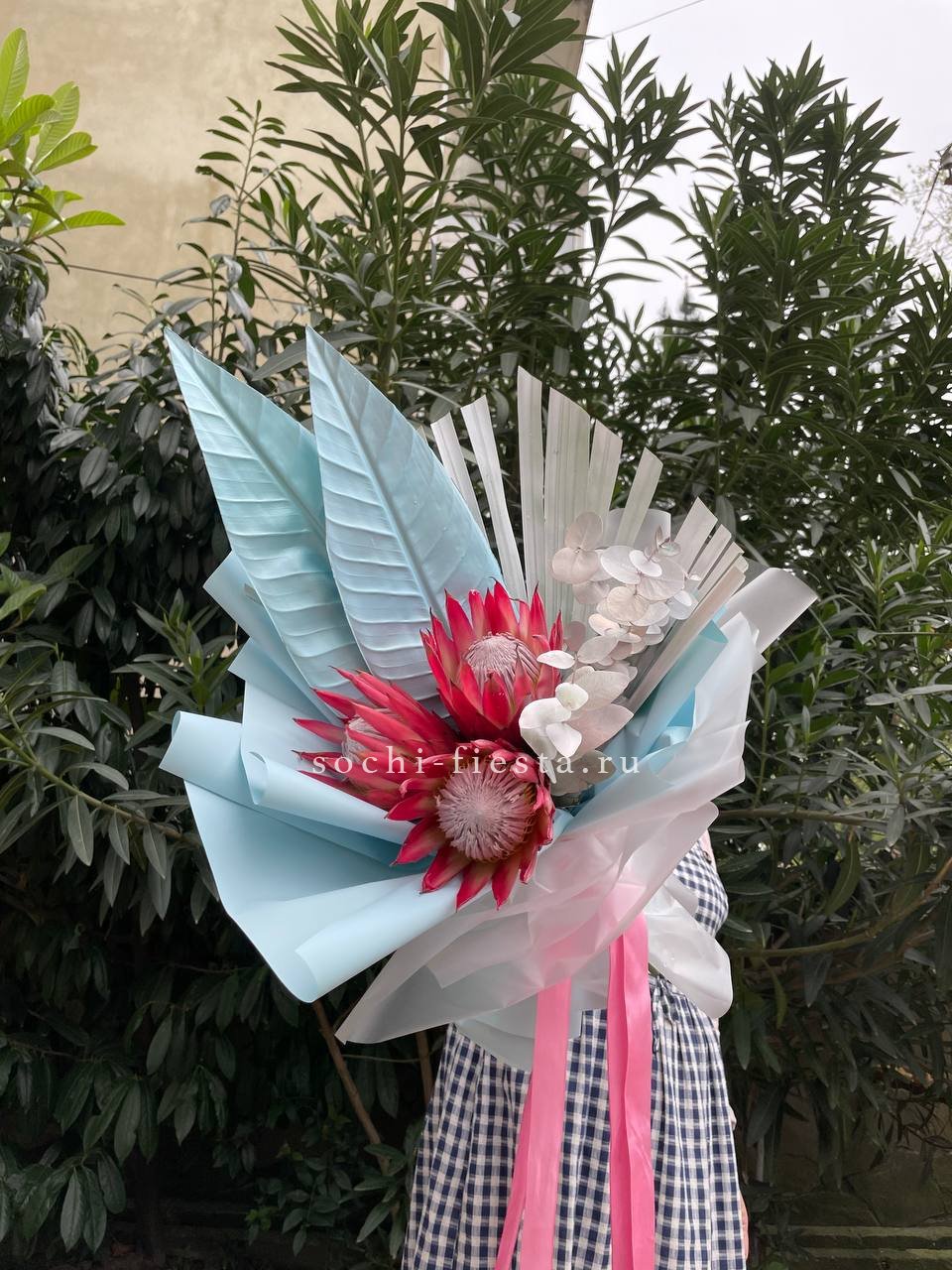 протея 3 шт., декоративная зелень в зависимости от сезона, дизайнерская упаковка.