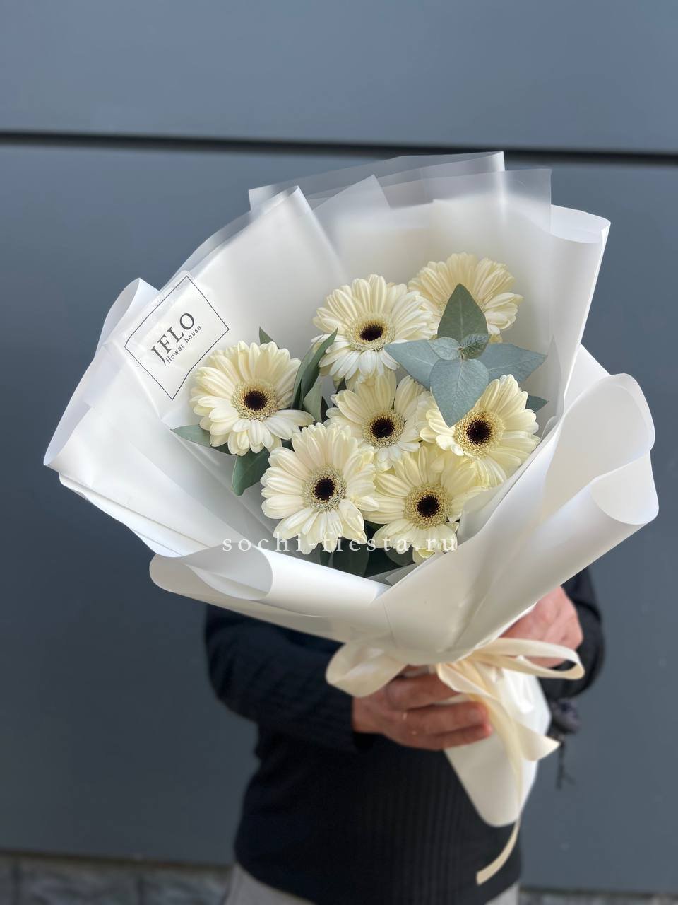 Семь голландских гербер собраны в лаконичный букет, где цвет можно выбрать по настроению. Крупные бутоны с чёткой графикой лепестков держат форму долго и радуют насыщенностью оттенка.