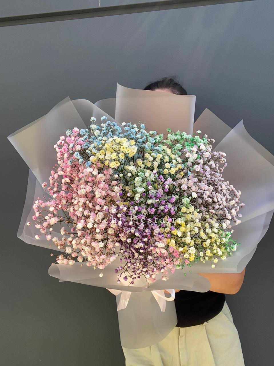 7 радужных голландских гипсофил, лента, комбинированная упаковка.