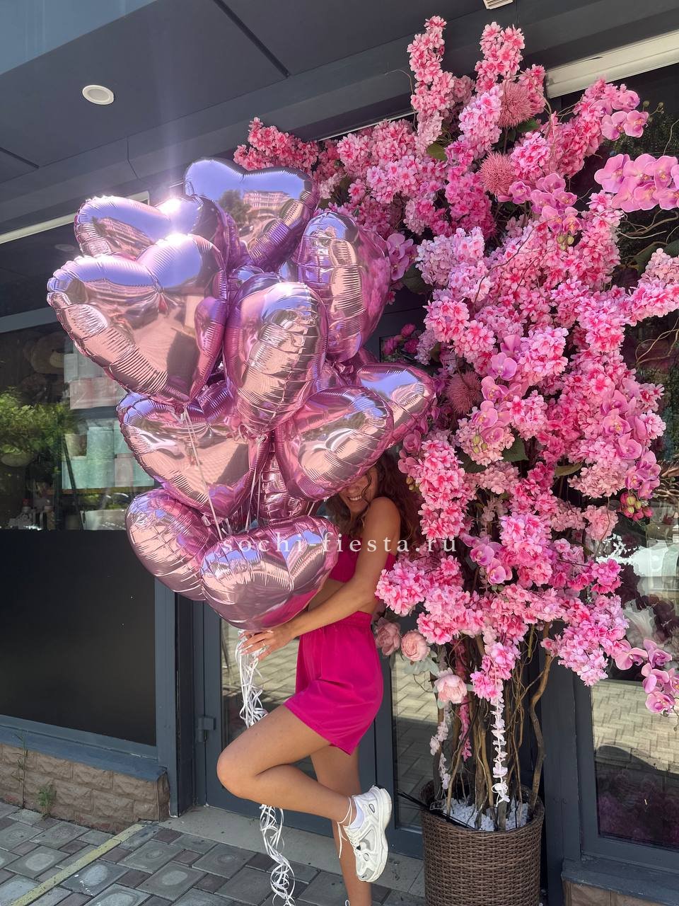 Пятнадцать соцветий гортензии образуют густую сферу с насыщенной глубиной цвета. Объёмная композиция заполняет пространство и притягивает внимание своей плотностью.