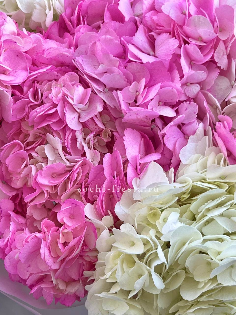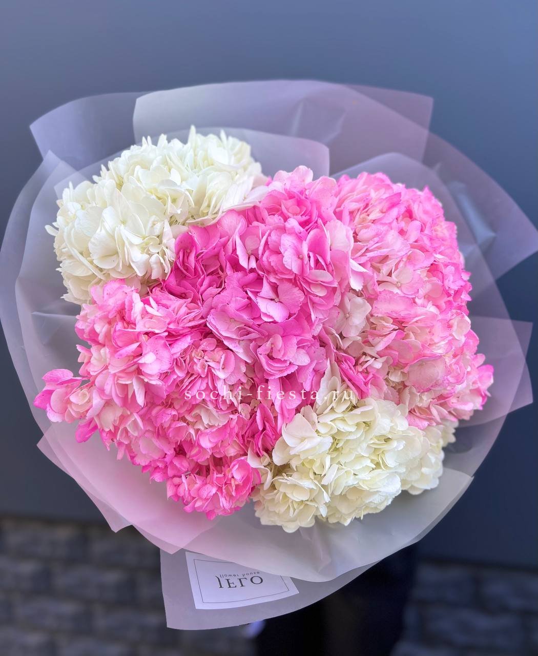 Пять соцветий гортензии в оригинальной упаковке-пиджачке. Необычная форма подачи превращает классический монобукет в яркий акцент для торжественного момента.
