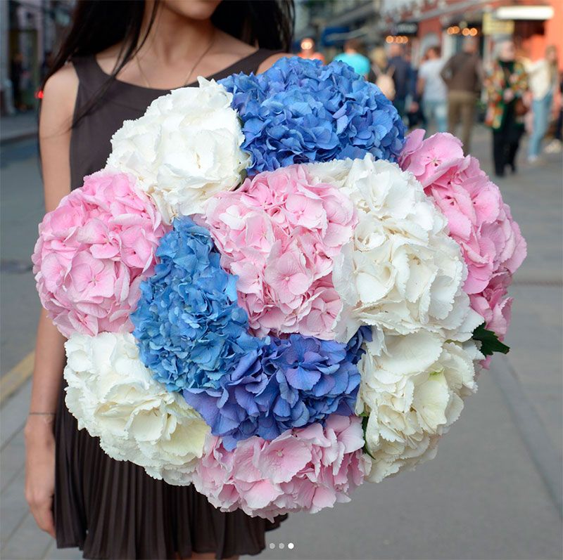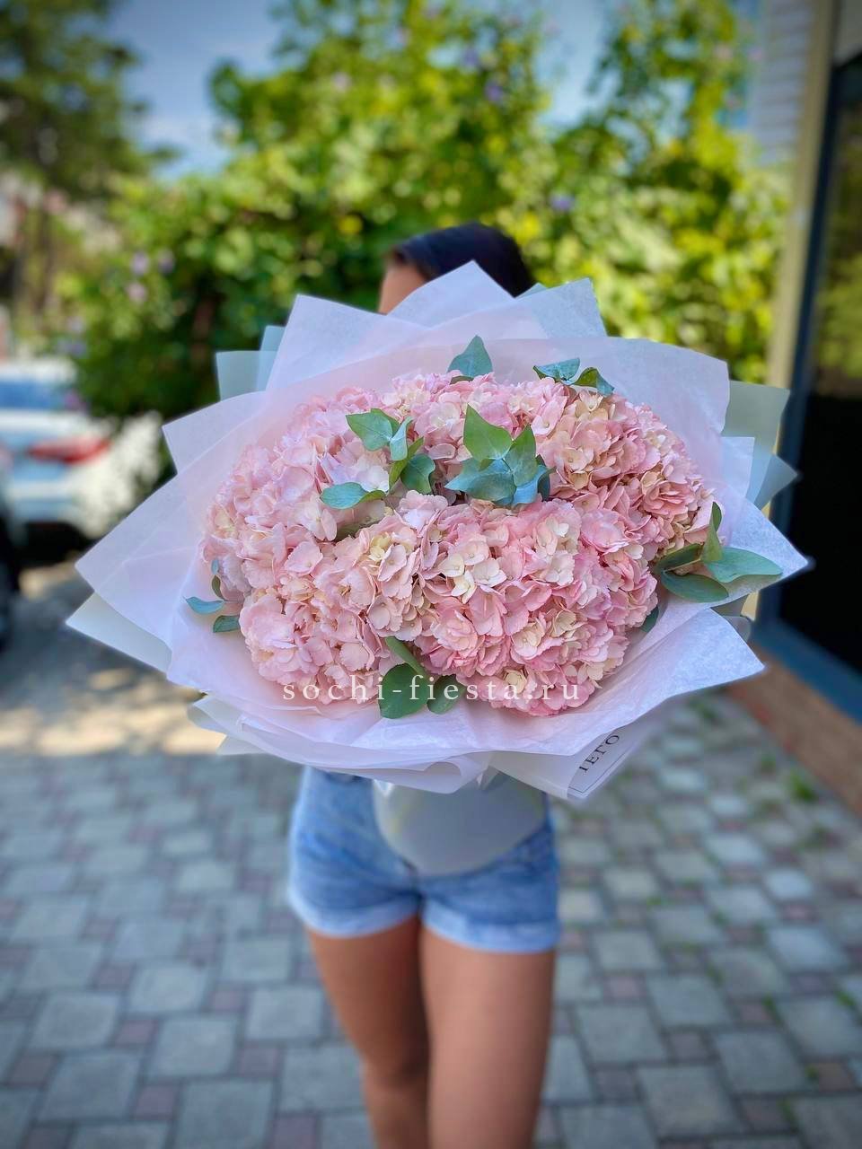 гортензия розовая 9шт., лента, дизайнерская упаковка. Цвет гортензий может незначительно отличаться.