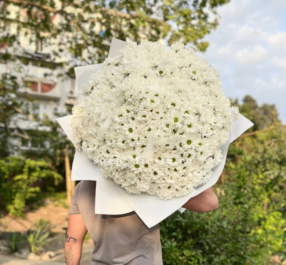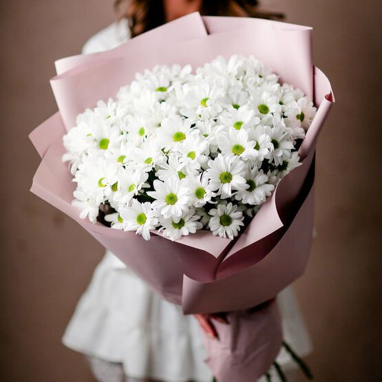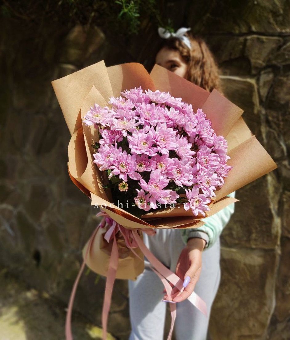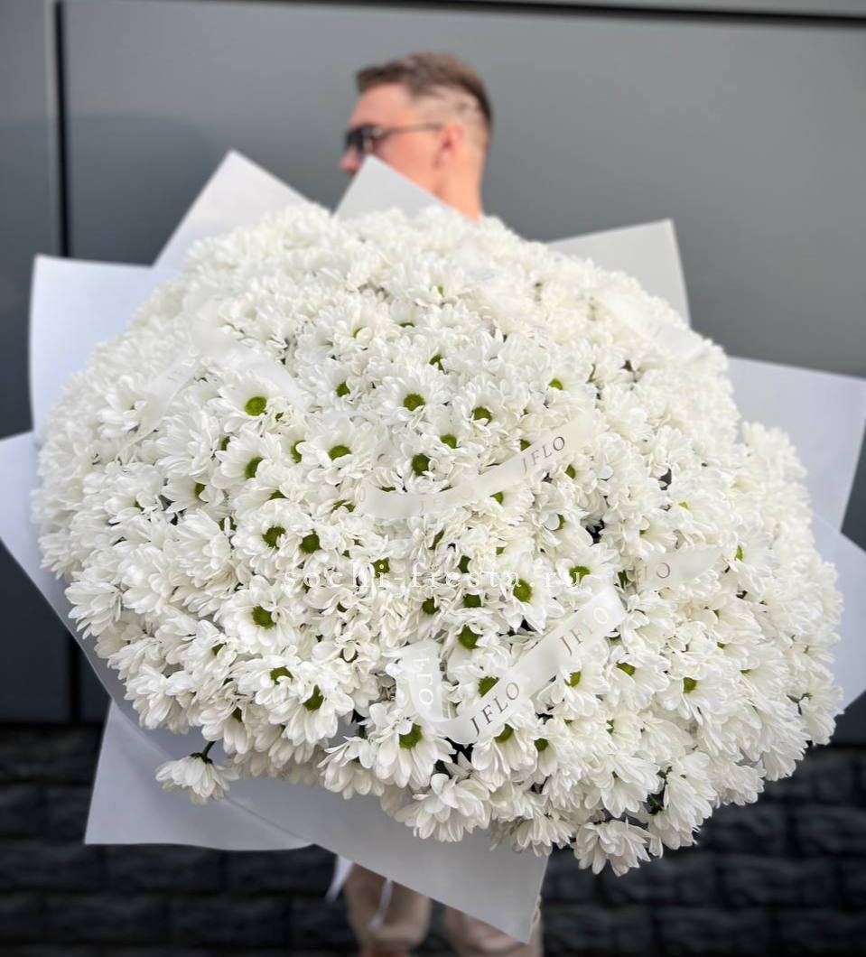 Семь пышных соцветий хризантемы с игривыми завитыми лепестками собраны в плотную композицию. Золотистый эвкалипт добавляет теплое мерцание и завершает образ. Яркий жест для тех, кто любит выразительные формы и живую энергию цветов.
