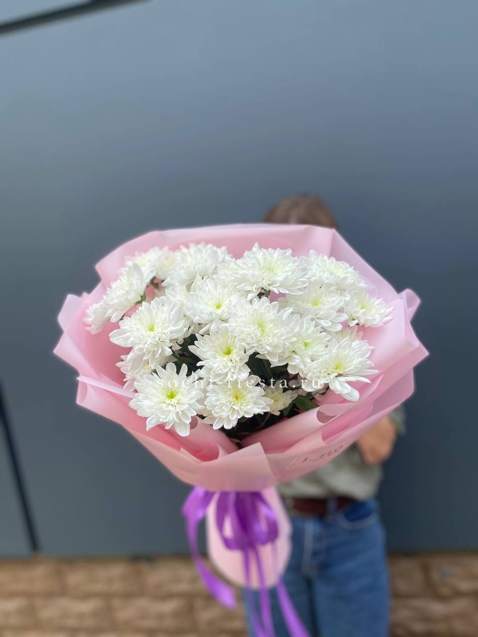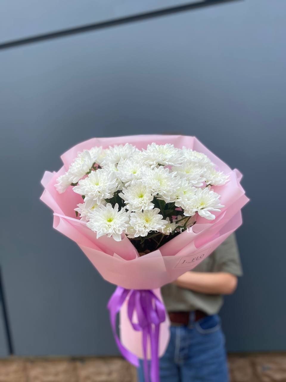хризантема одноголовая - 9 шт., хамелациум, 5-7 шт., лента, дизайнерская упаковка.