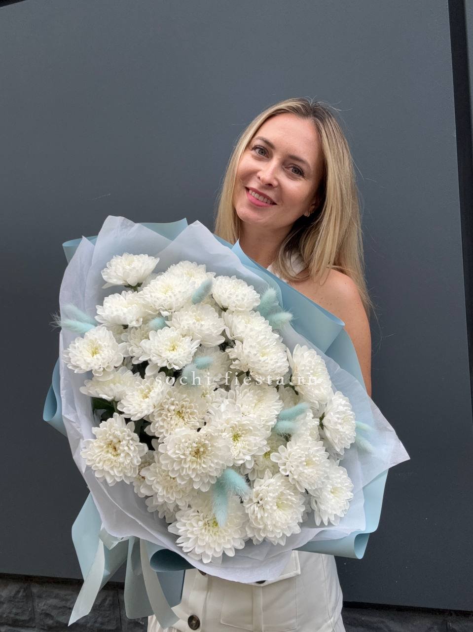 Девять кустовых хризантем сплетаются с пушистыми колосками лагуруса в воздушную композицию. Мягкие текстуры и природная простота создают ощущение прогулки по летнему полю.