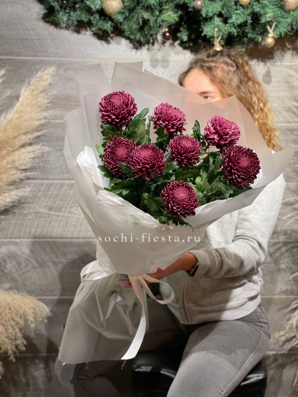 Девять хризантем Бигуди с игольчатыми лепестками необычной формы. Каждый бутон напоминает фактурный шар с закрученными концами, создавая эффектную текстуру и живую динамику.