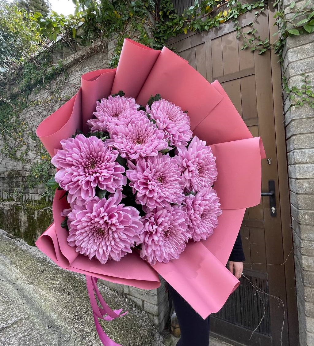 Сорок один бутон собран в плотное соцветие. Хризантемы формируют округлый силуэт с равномерным ритмом и чистой графикой. Монохромное решение с выразительной структурой.