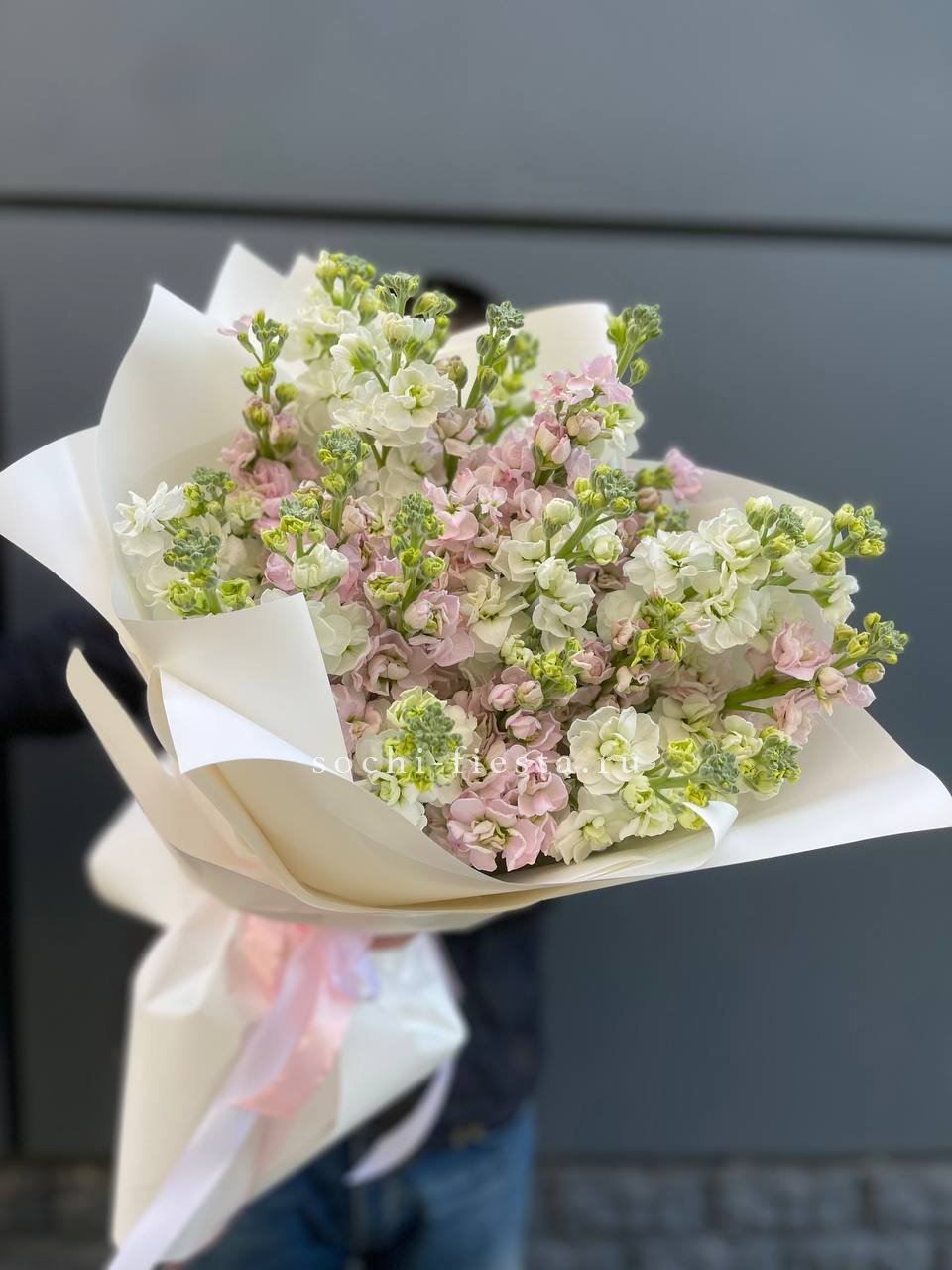 Двадцать девять веток маттиолы создают воздушное облако с насыщенным запахом и мягкими переходами оттенков. Лепестки раскрываются постепенно, меняя силуэт букета день за днём.
