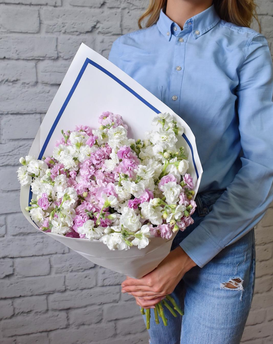 маттиола нежных тонов - 15 веток, лента, крафт или дизайнерская пленка.