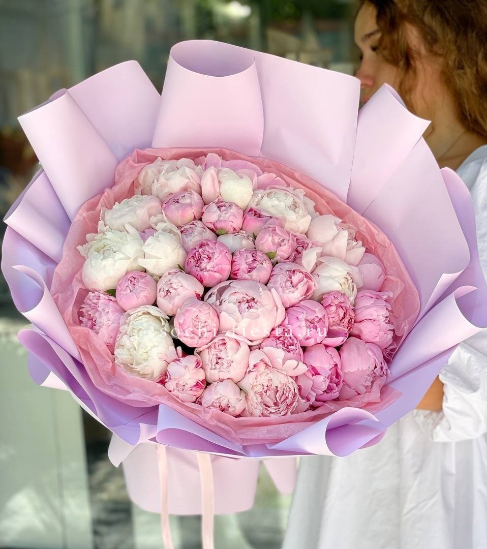 пион 51 шт., лента, дизайнерская упаковка комбинированная.