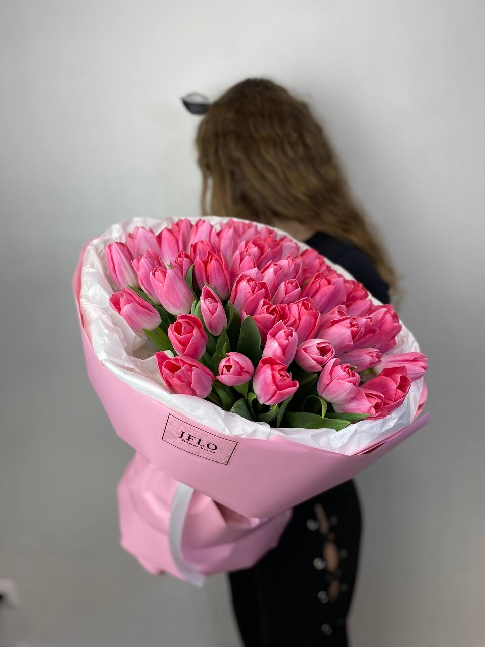 Сто один тюльпан в светлой гамме создаёт впечатляющий объём и выразительное присутствие. Плотная сборка бутонов образует графичную форму с чётким силуэтом.