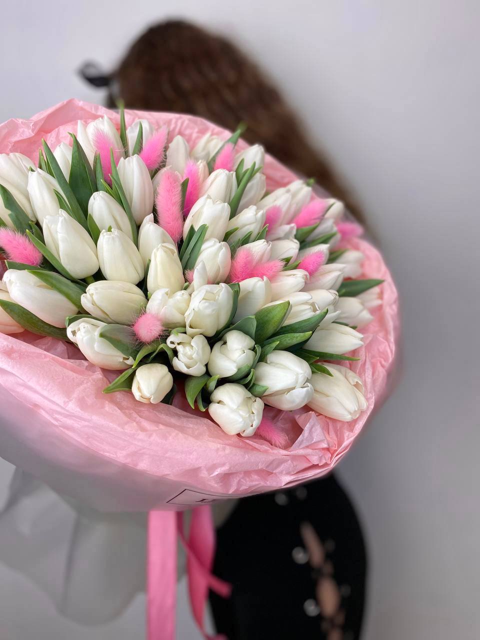 101 белый тюльпан, лента, крафт или дизайнерская пленка.