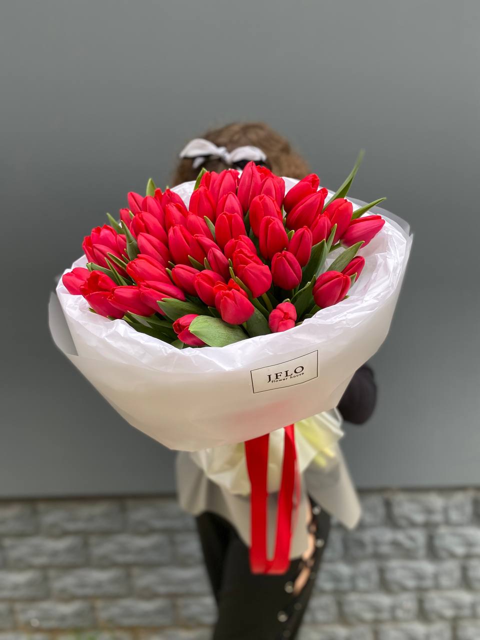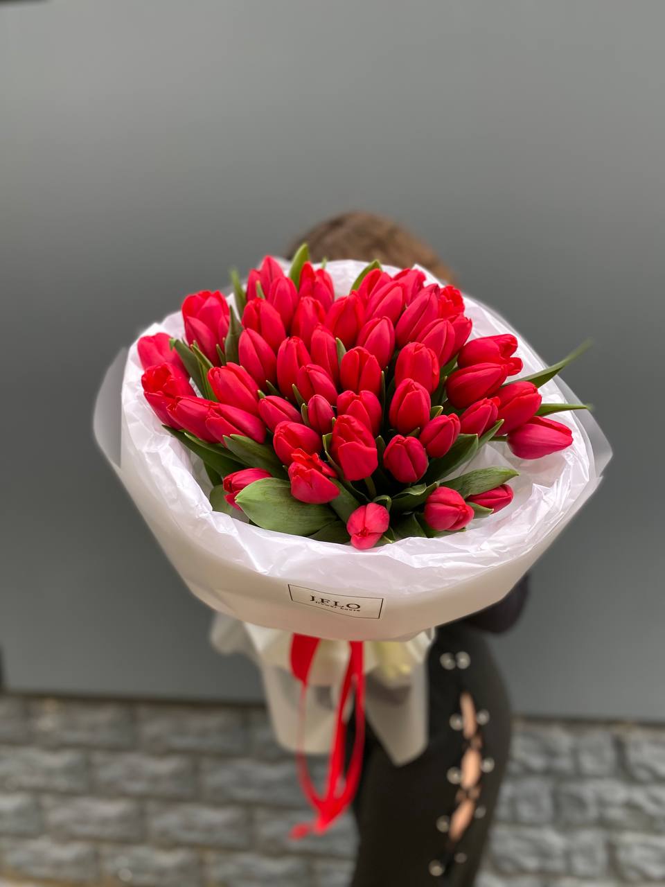 Пятьдесят один тюльпан Rainbow собран в яркую радужную композицию. Оттенки переплетаются и создают живую динамику, где каждый стебель добавляет свой цветовой акцент в общую палитру.