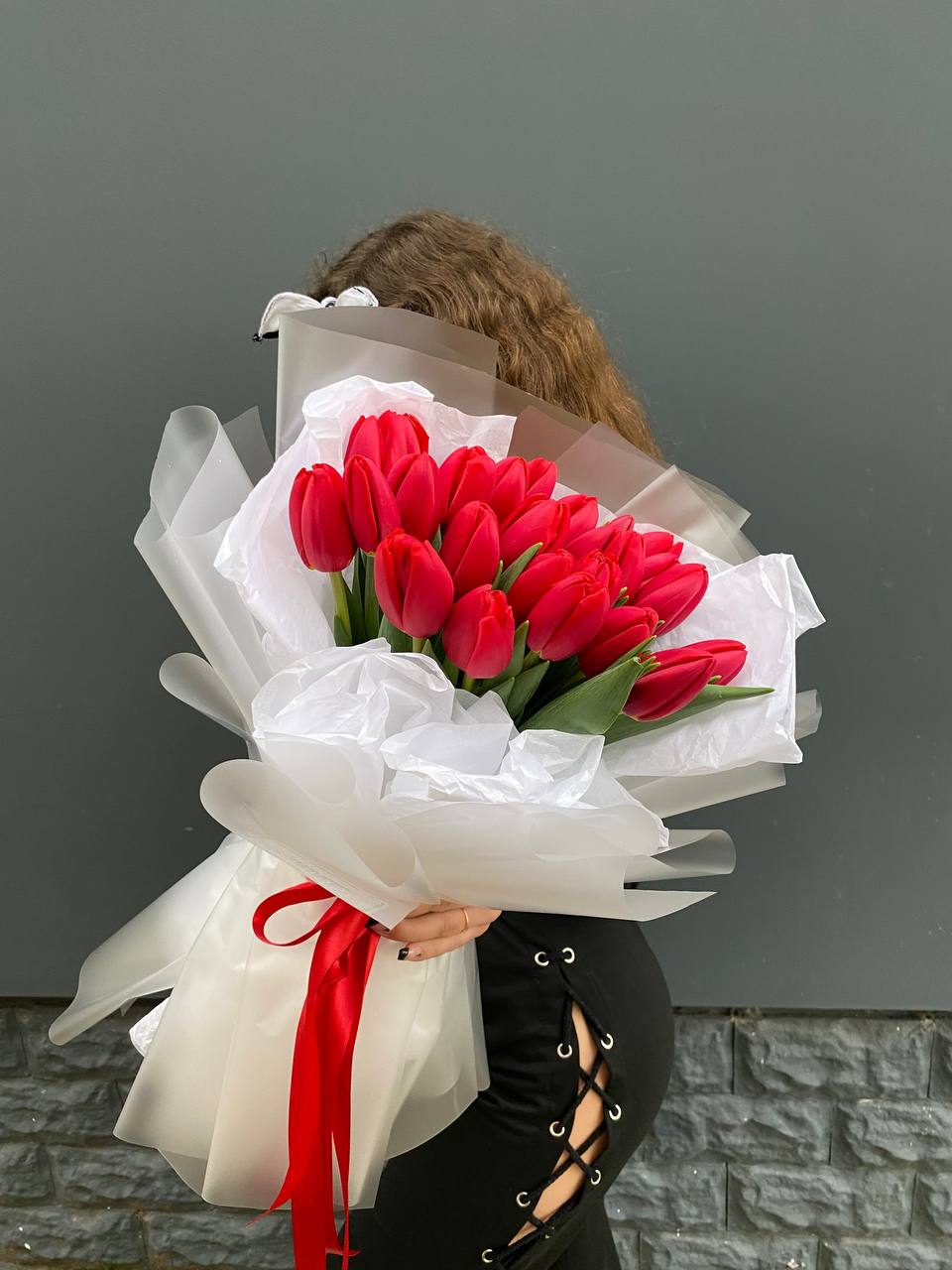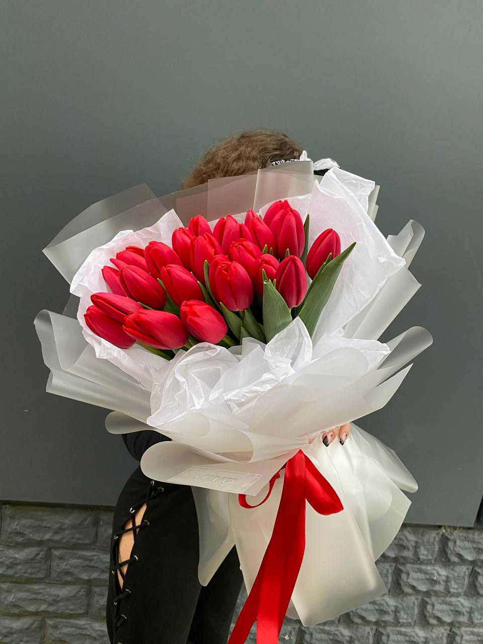изначальная цена указана за букет из 15 тюльпанов Состав букета на фотографии: 25 тюльпанов, лента, упаковка.