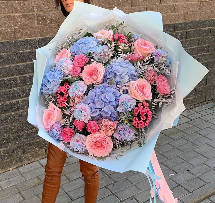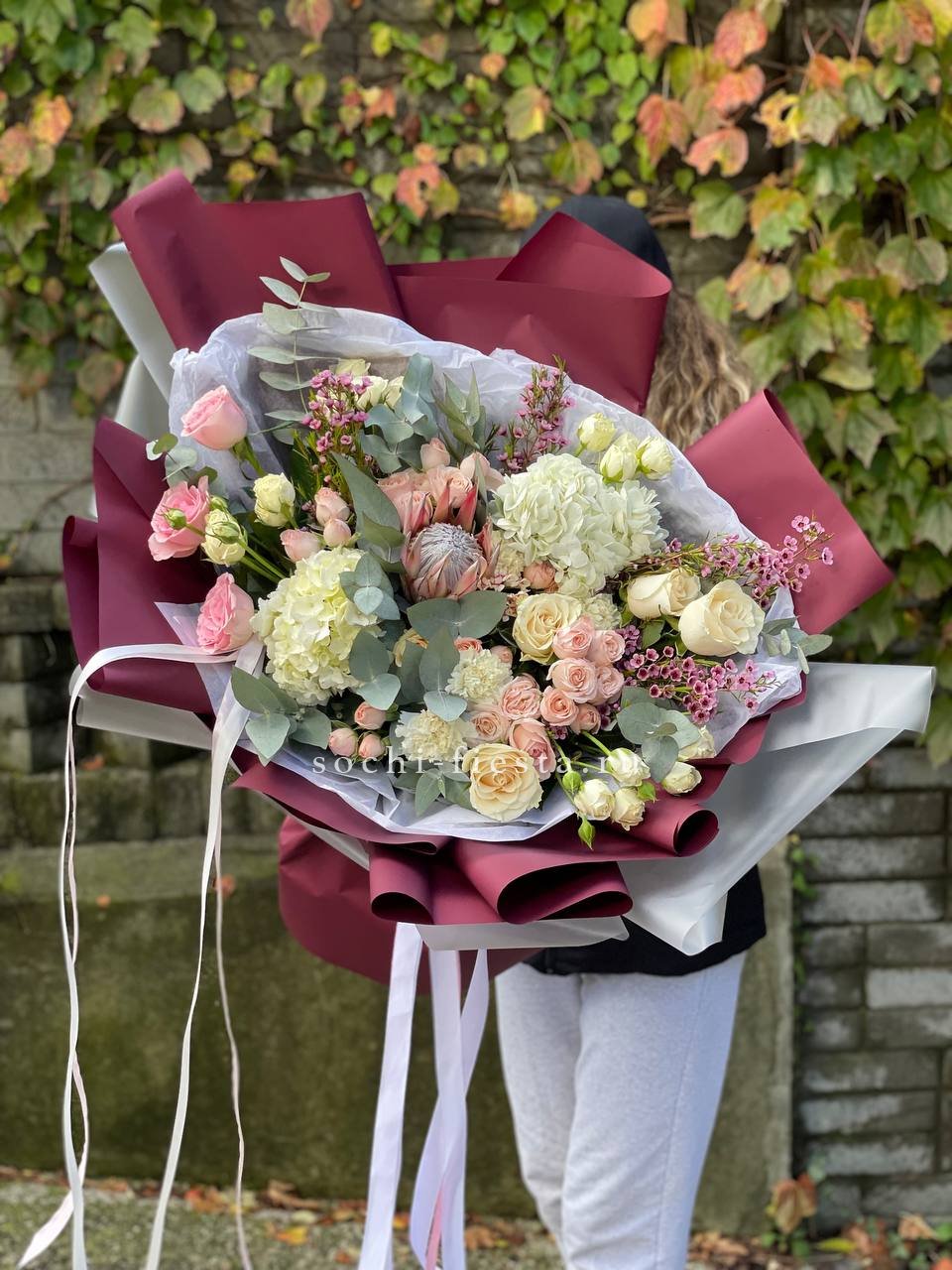 композиция из гортензий, протеи, хамелациума, роз, эвкалипта, бомбастика, диантусов в авторском оформлении.