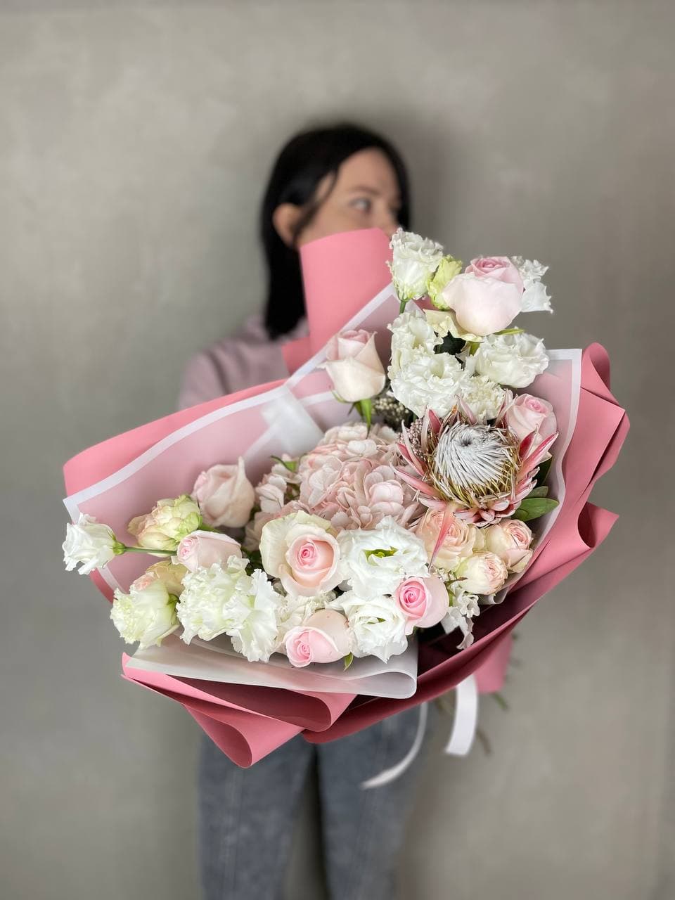 Пионовидные розы образуют пышное ядро композиции, а диантусы добавляют воздушные акценты по краям. Эвкалипт создает естественное обрамление, подчеркивая объем и глубину сборки. Букет для тех, кто ценит авторский взгляд на классические формы.