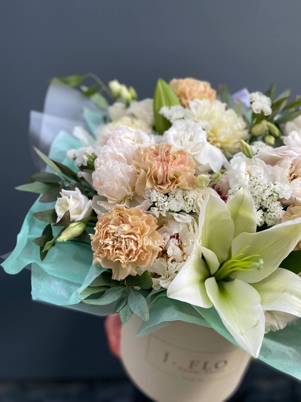 лилии, диантусы, статица, пионы или замена в не сезон эвкалипт, цилиндр.Состав может меняться в зависимости от сезона.