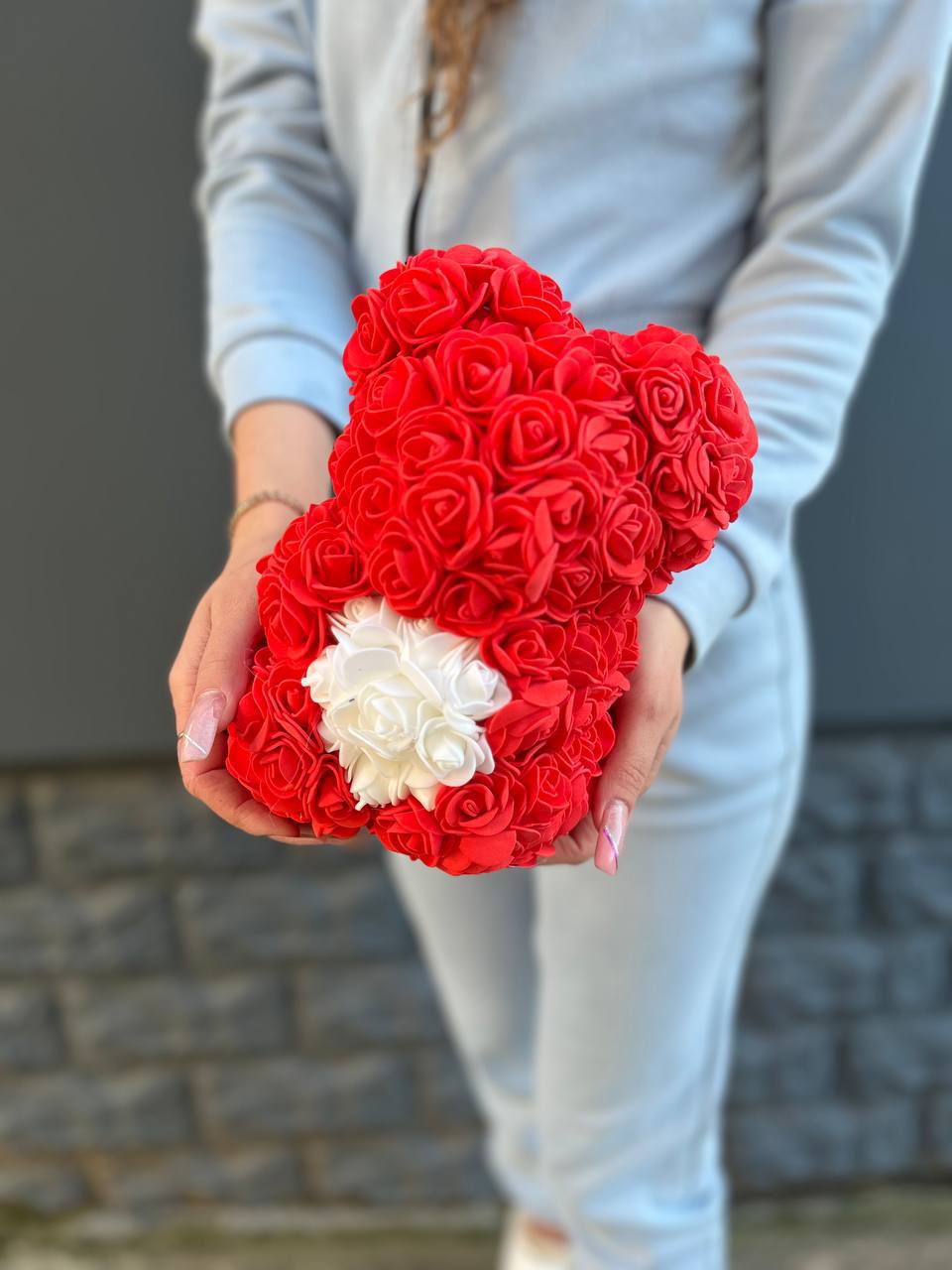 Красный медведь из фоамирана с объёмным белым сердцем в центре. Мягкие ровные ряды лепестков создают плотную текстуру, а контрастная вставка добавляет выразительности силуэту.