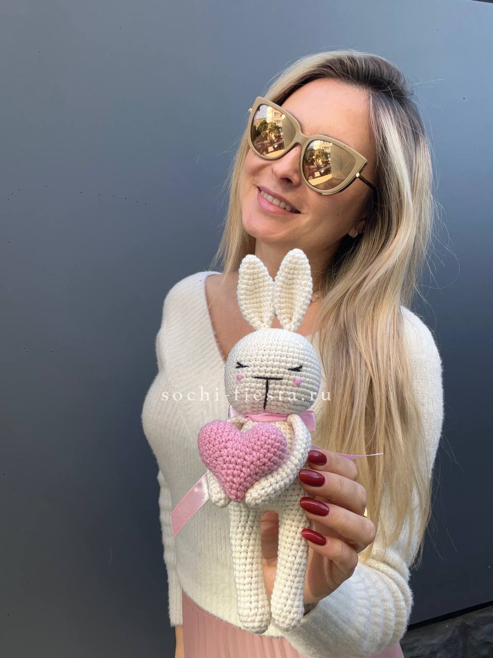 на фотографии зайка ручное плетение. Доставка данной товарной единицы бесплатна при условии её заказа с цветами.