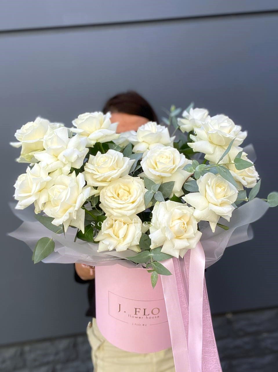 Белоснежные розы переплетаются с лиловыми нотами маттиолы и диантусов. Кустовые соцветия и эвкалипт создают воздушную текстуру в компактном джутовом обрамлении.