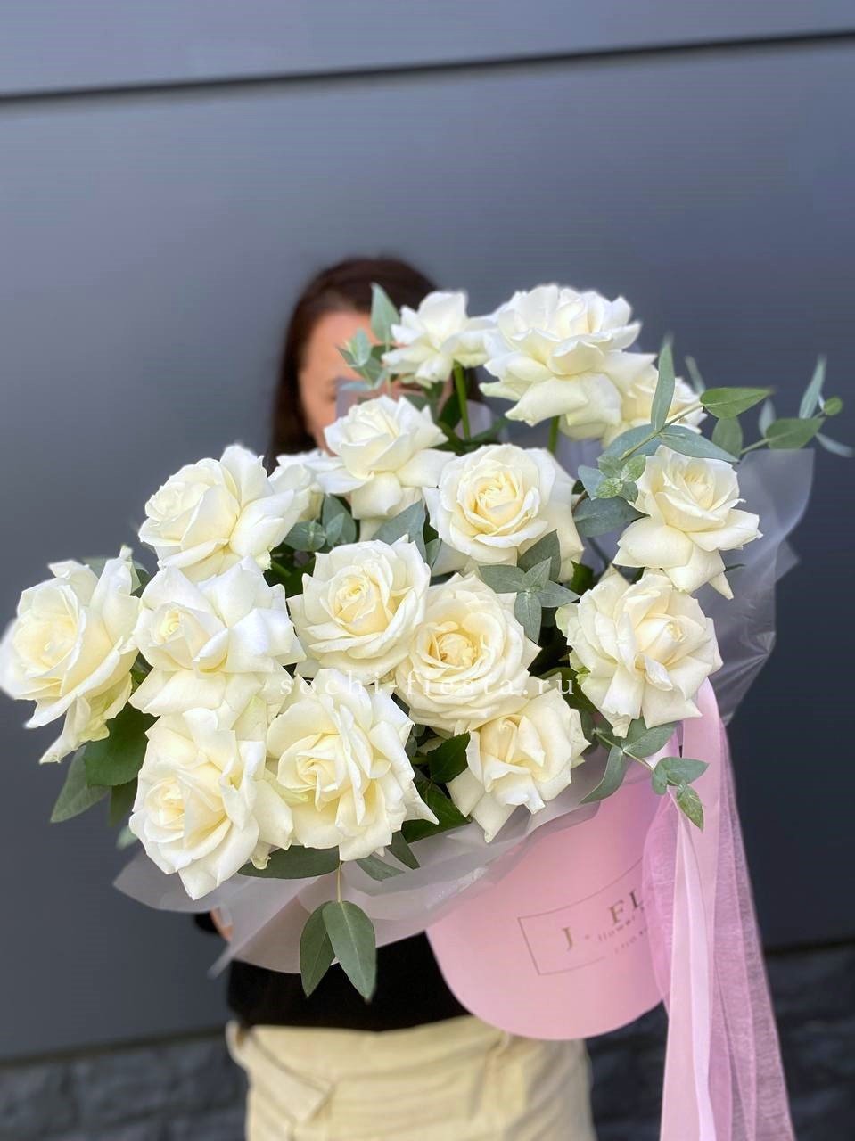 белые розы, маттиола, диантусы, кустовые розы,эвкалипт.