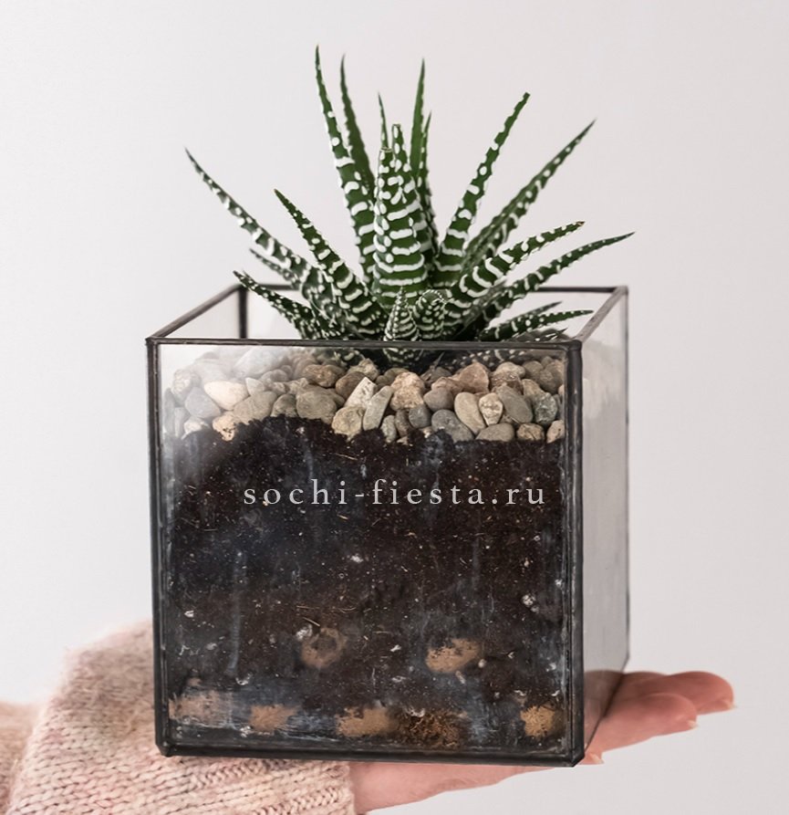 Компактный куб из стекла вмещает хавортию с острыми листьями и выразительной графикой. Это живое решение для рабочего стола или полки, где важна лаконичность.