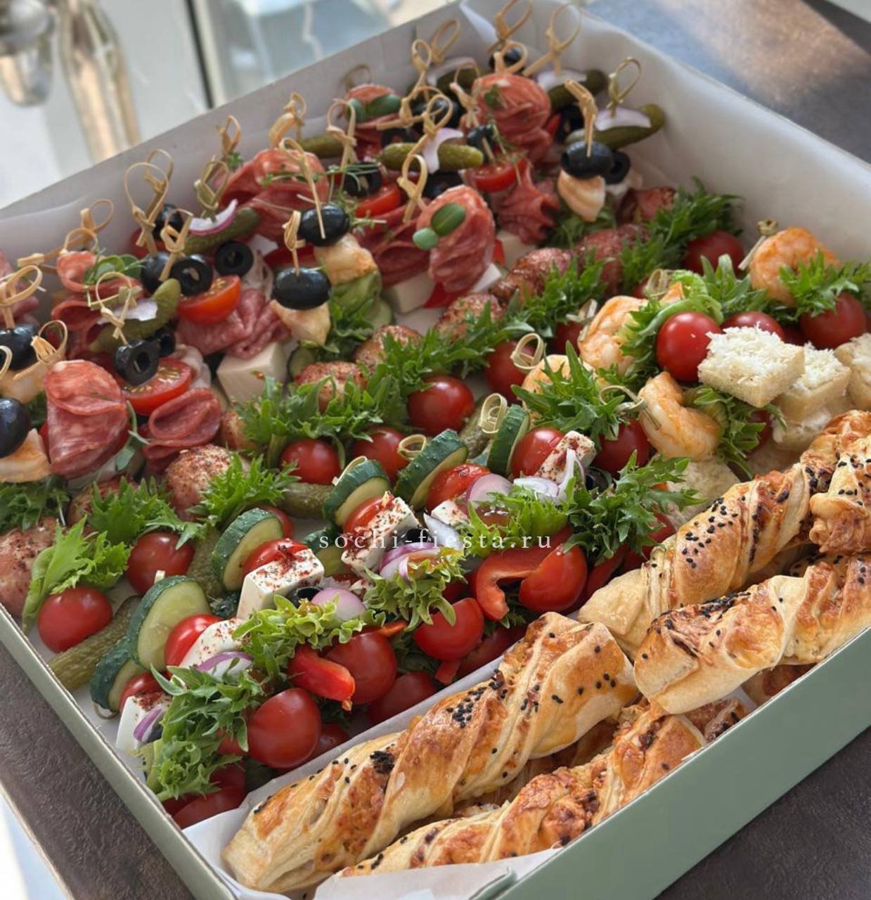 сезонные овощи с муссом из кальмара и авокадо. Щедро уложены в несколько слоев. Вес 2-2,5 кг. Бокс рассчитан на 8-10 персон.