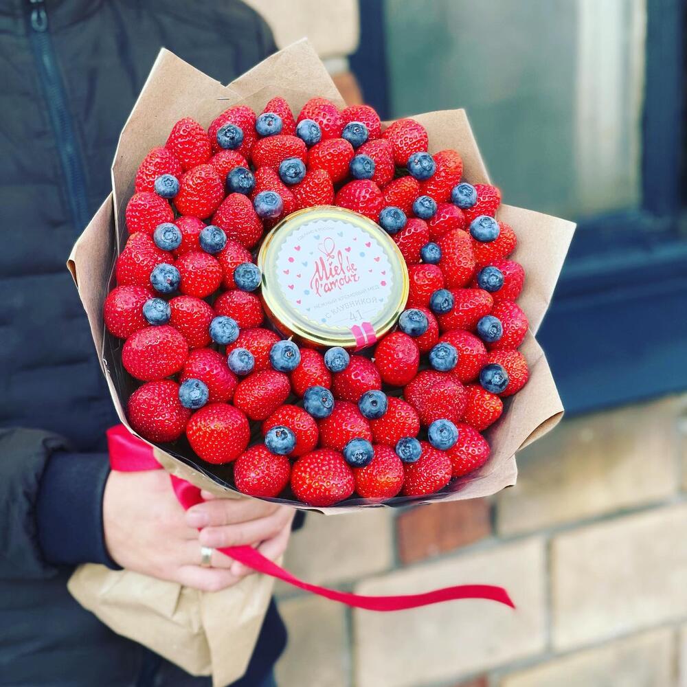 1100-1200 г. ароматной клубники, 100г. голубики, баночка мёда, лента, крафт.