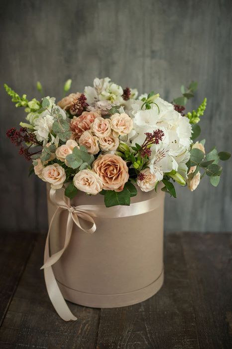 Компактная композиция с пионами и розами в круглой коробке собрана плотно и аккуратно. Диантусы добавляют воздушную фактуру между крупными бутонами. Цвет упаковки можно выбрать под интерьер или любимую палитру.