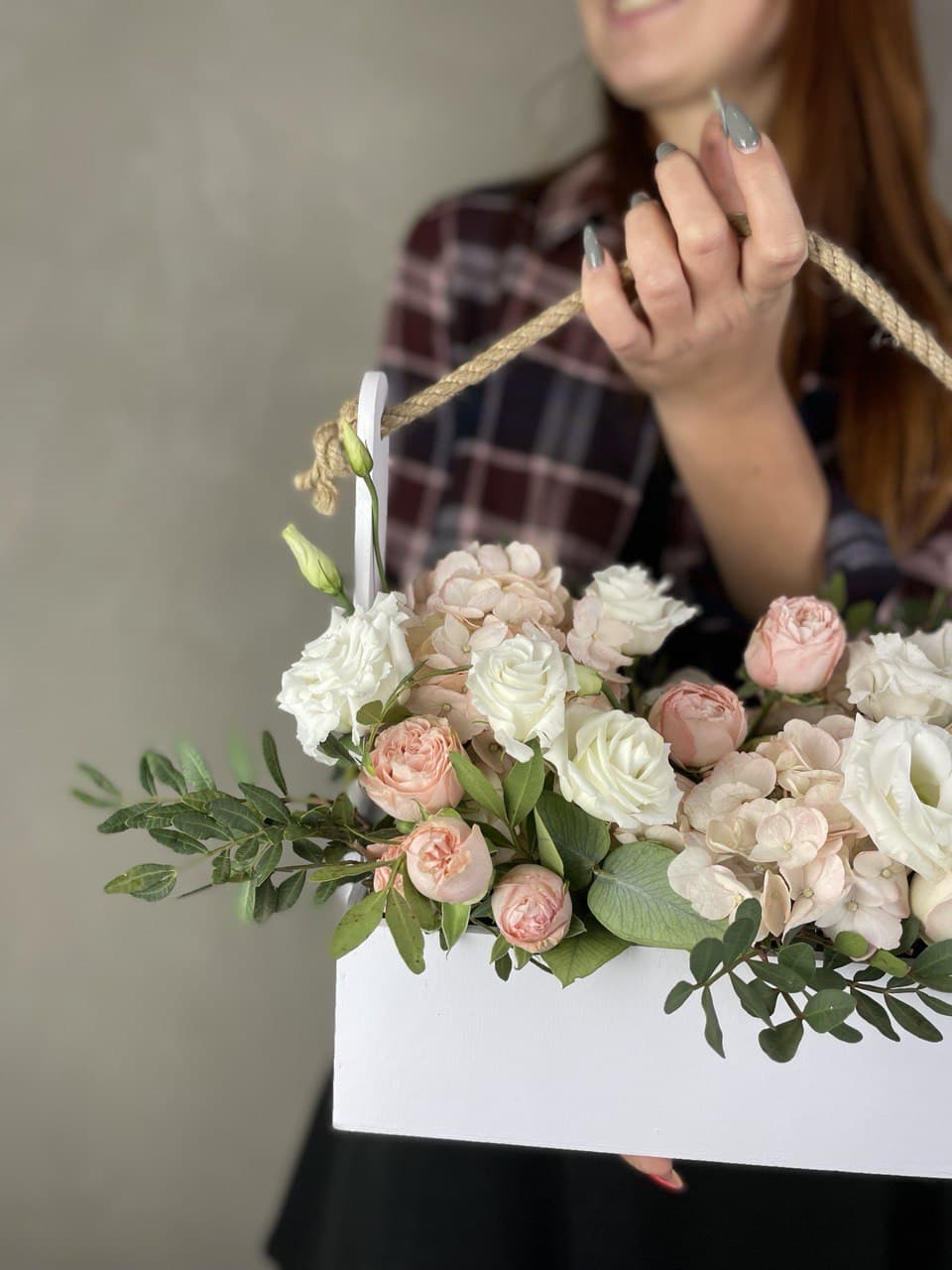 Деревянный ящик собрал в себе плотные бутоны кустовых роз, воздушную эустому и пышные соцветия гортензии. Зелень фисташки добавляет объём и завершает форму композиции.