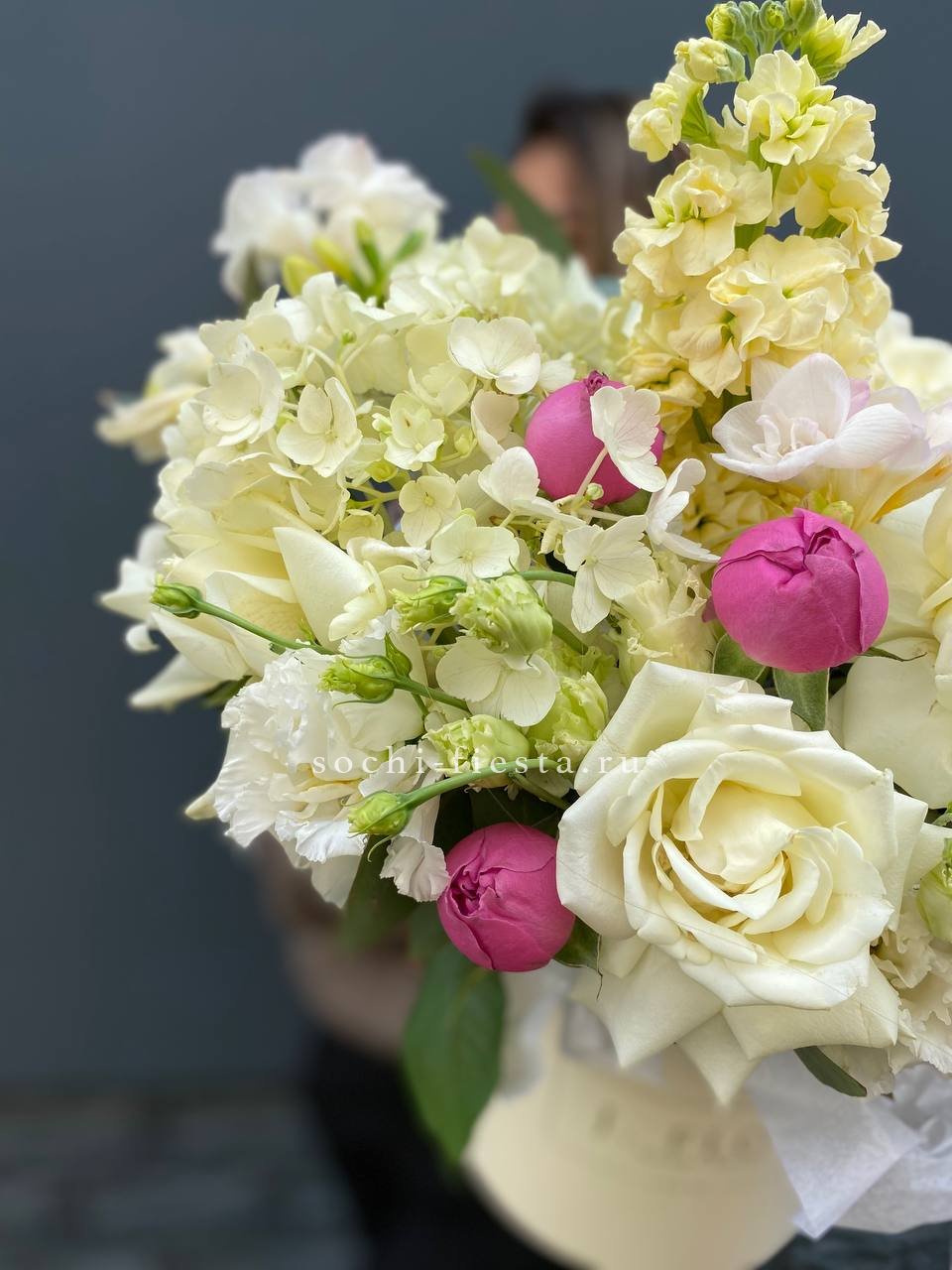 Французские розы раскрываются крупными бутонами рядом с воздушной эустомой и пушистой гортензией. Маттиола наполняет композицию тонким ароматом.