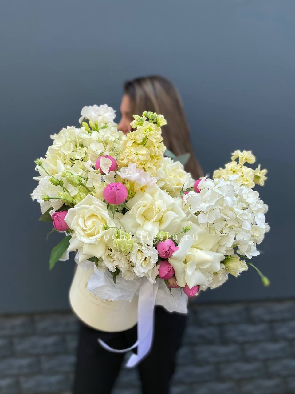 белые французские розы, эустома, гортензия, маттиола,  цилиндр D16.
