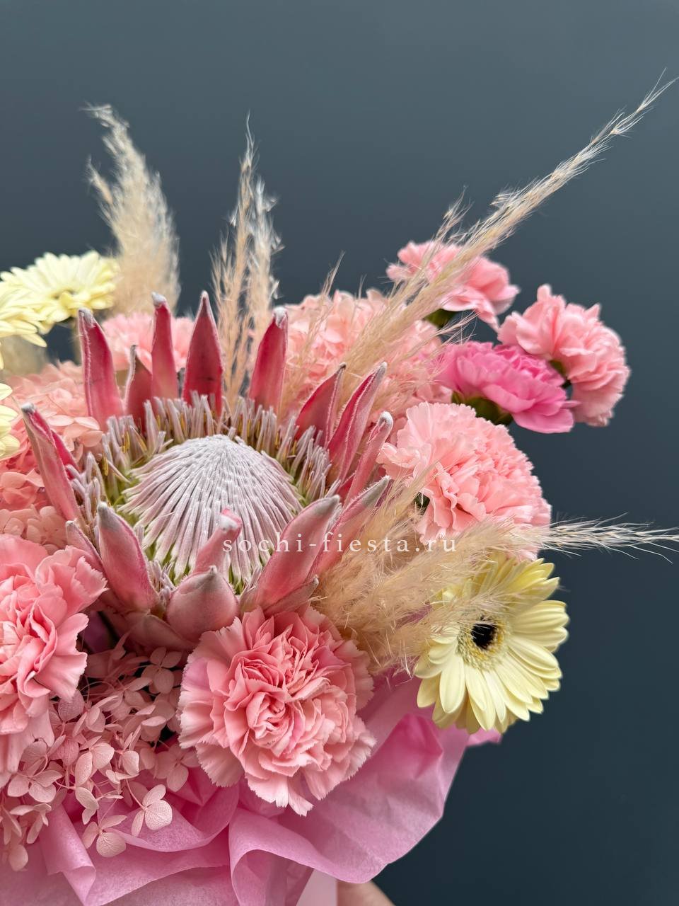 протея, гортензия, герберы, диантусы, картадерия цилиндр D16.