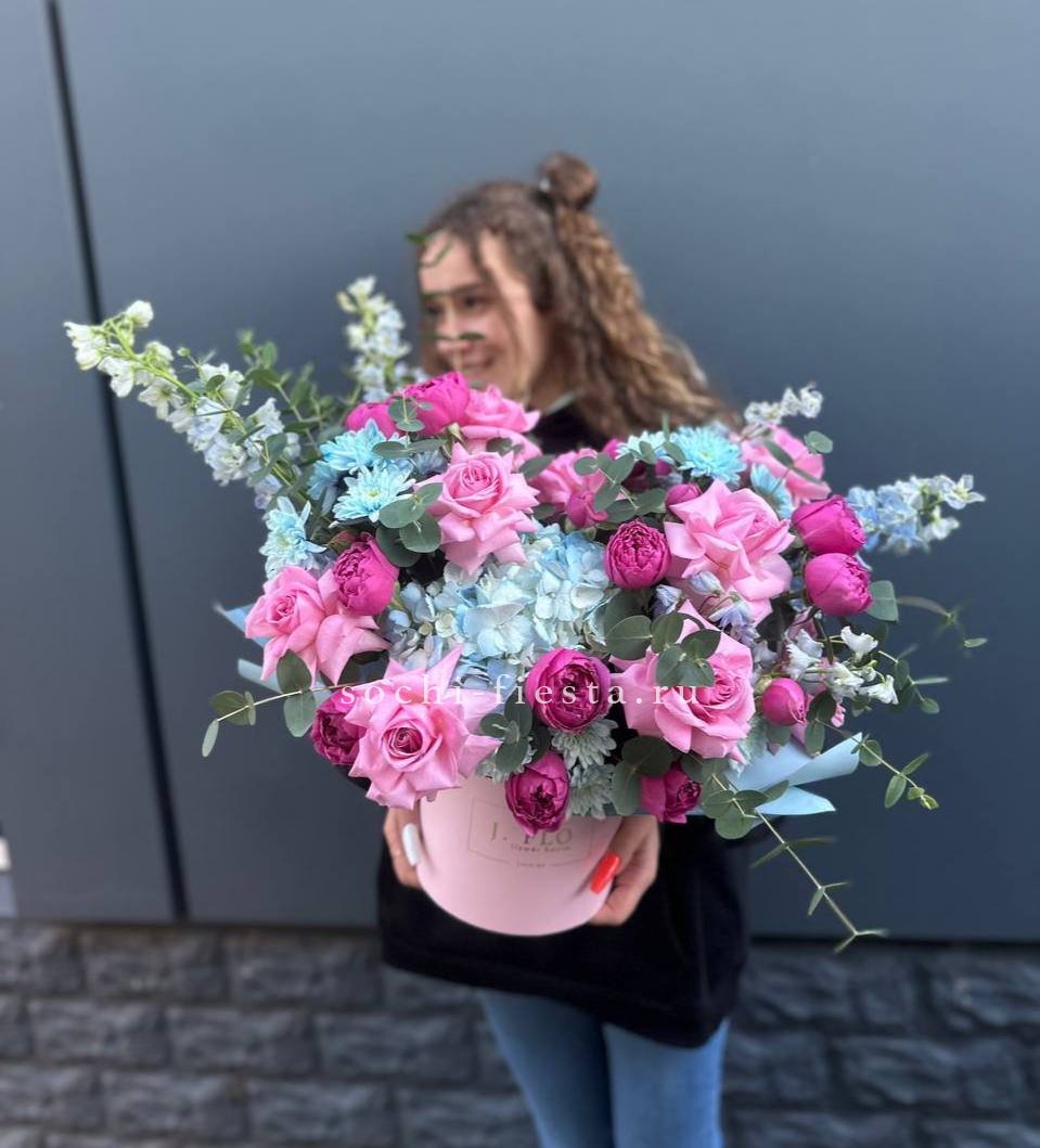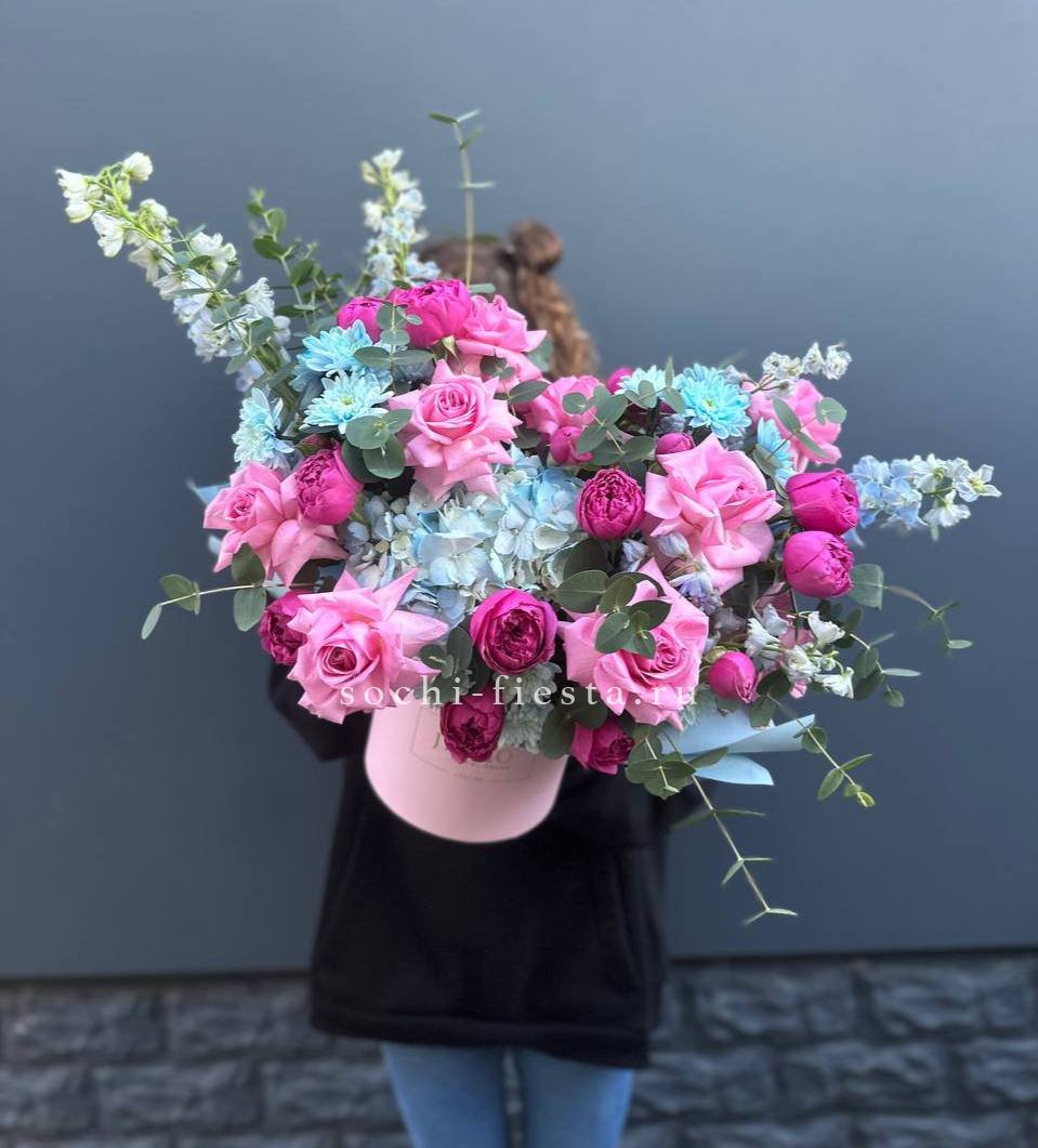 гортензии, пионовидные кустовый розы, декоративная зелень, бокс D25.