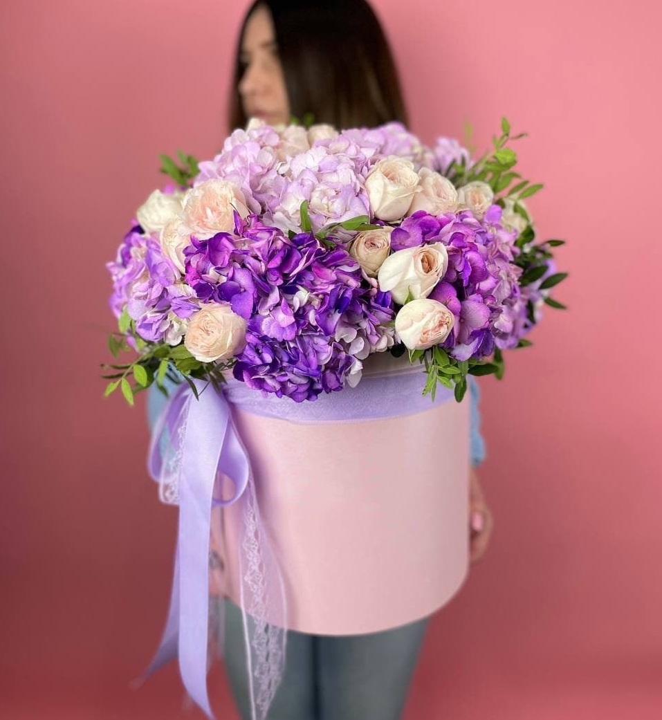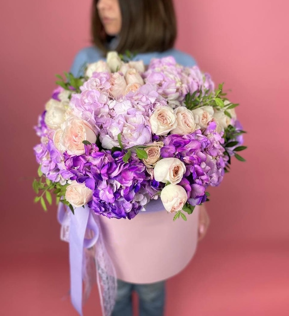 Пышная гортензия и махровые кустовые розы создают густую фиолетовую волну в круглом боксе. Каждый бутон раскрыт по-своему, а зелень добавляет графику по краям композиции.