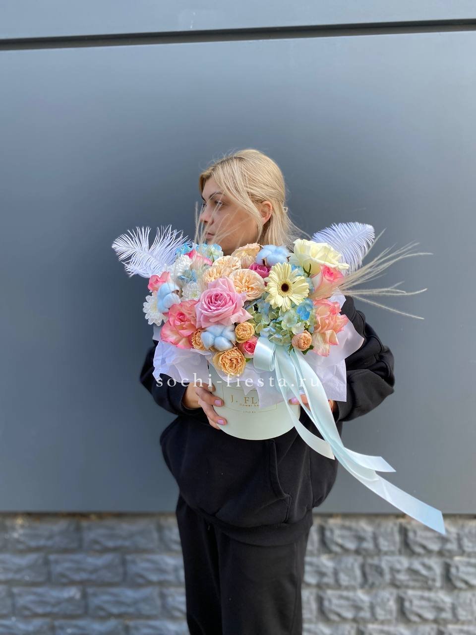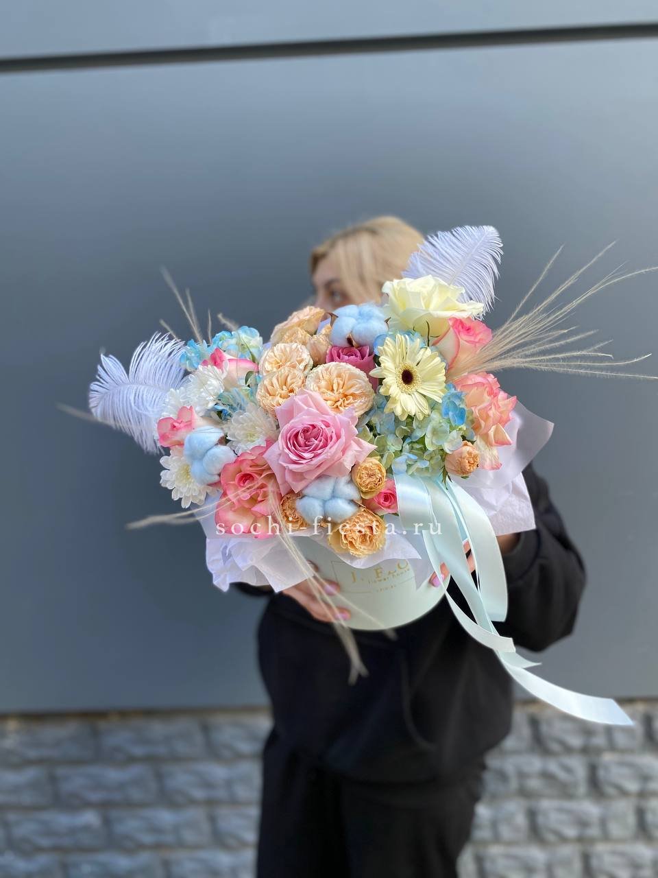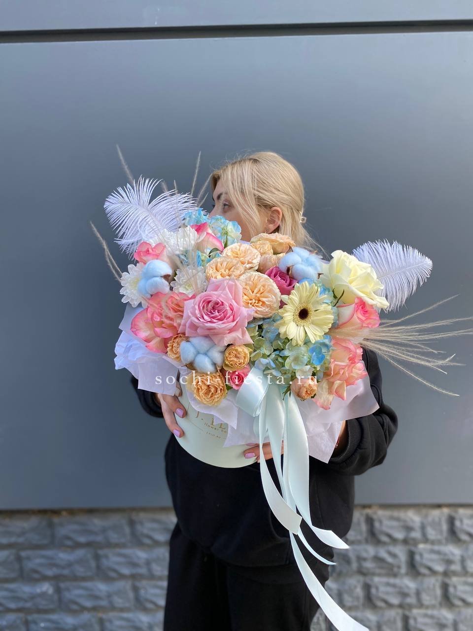 бокс из нежных розово-голубых цветов, розы, герберы, гортензии.