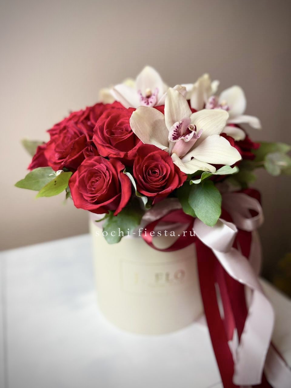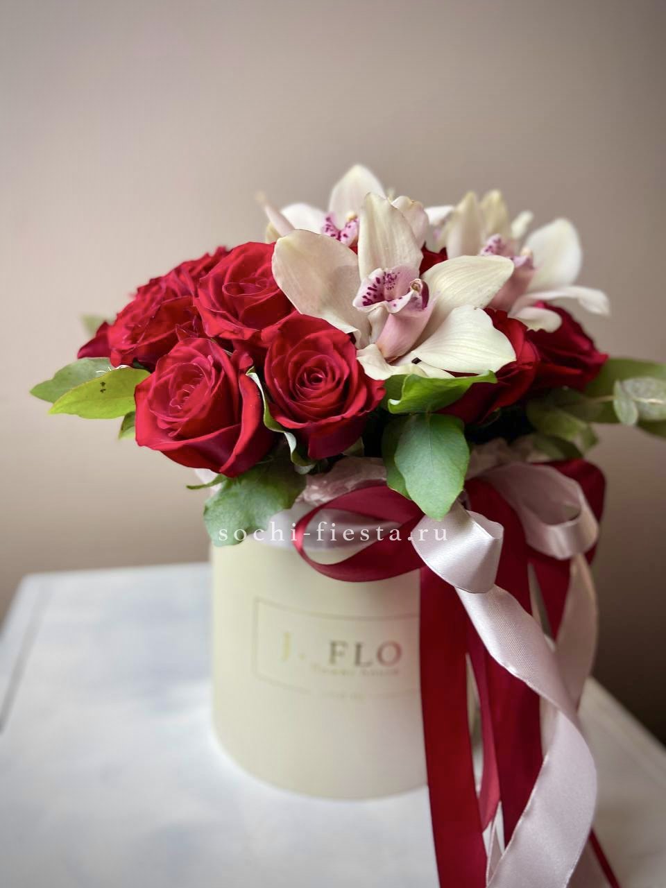 орхидея цимбидиум, декоративная зелень, бокс D16, тишью.